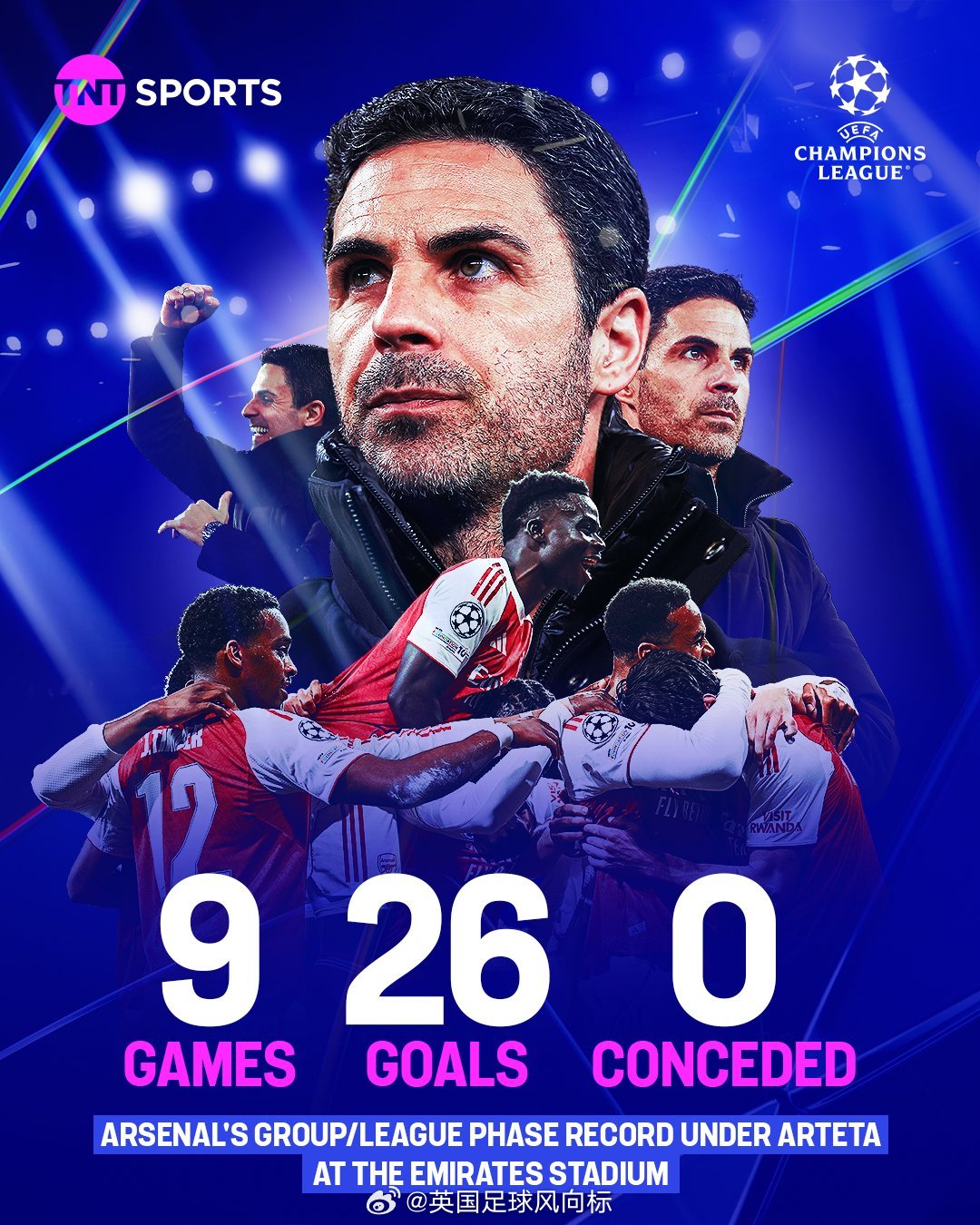 【阿森纳欧冠主场零失球】无论是欧冠正赛改制前的小组赛阶段,还是改制后的联赛阶段,在阿尔特塔执教下的阿森纳,一共踢了9场主场比赛,打进26球,失球为零!