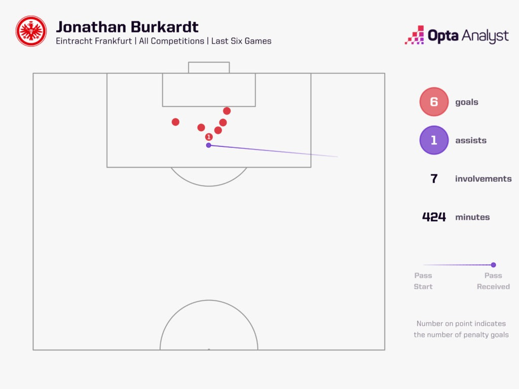 这位前美因茨前锋在近六场俱乐部比赛中贡献6球1助攻,其中包括两场欧战赛事。布尔卡特也是法兰克福队史仅有的三位在欧洲冠军杯/欧冠联赛前两次出场均有进球的球员之一,另外两位是1959年11月的埃里希·鲍姆勒和1960年3月的埃里希·迈尔。