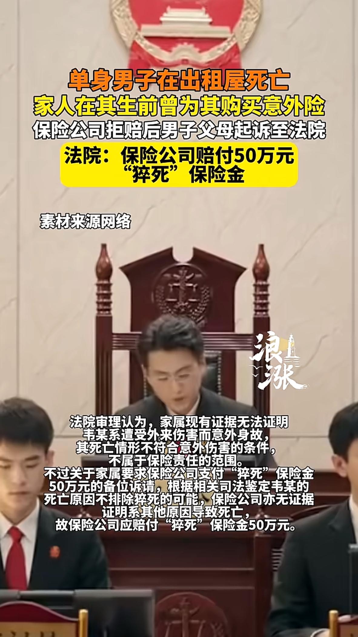 单身男子在出租屋死亡 家人在其生前曾为其购买意外险 保险公司拒赔 刚痛失爱子又遭理赔闭门羹 老两口的绝望简直雪上加霜 买保险时说得花好月圆 真要赔钱就开始鸡蛋里挑骨头 一口咬定不是外来伤害不算意外 合着猝死就不算生命意外陨落 还好法院明镜高悬 没让保险公司的歪理得逞 拿不出证据反驳猝死可能 就得按约定掏五十万 这哪是拒赔分明是耍赖 保险合同不是废纸一张 别以为普通人好拿捏 法律面前谁也不能胡作非为 买保险图的是安心不是添堵 保险公司该有的担当不能少 你说遇到这种理赔纠纷该不该硬刚到底