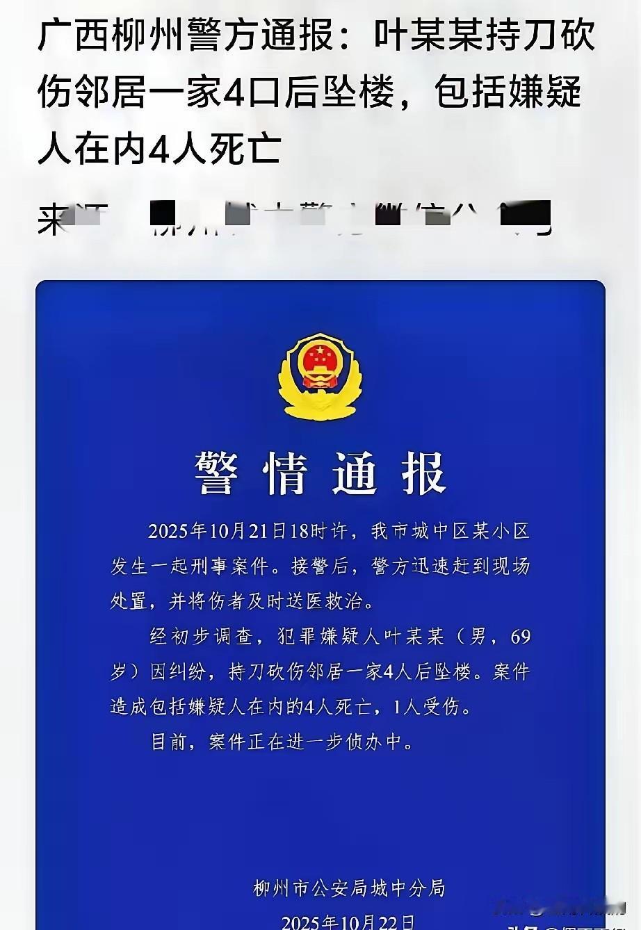 都说远亲不如近邻,可柳州某小区邻居间的纠纷命案,让人触目惊心!四条人命没了,其中还有个年幼的孩子。那句老话“远亲不如近邻”,在血淋淋的现实面前显得格外刺眼。 34岁的男主人和他2岁的儿子都没能幸免。最终4死1伤,连69岁的行凶者也坠楼身亡。一桩纠纷,毁了几个家庭。 这已经不是简单的“邻里不和”,而是长期积怨下的极端爆发。69岁的凶手选择同归于尽,更说明矛盾早已深到无法化解。而最让人心疼的是,那个2岁的孩子——他本不该为成年人的冲动买单。 其实想想,现在住楼房,邻居间的关系淡漠了很多。不是说大家非要亲如一家,但见面点个头,有事帮把手,有问题协商解决,这份人情味才是最好的“安全网”。 真心希望,这样的悲剧能少一点,再少一点。