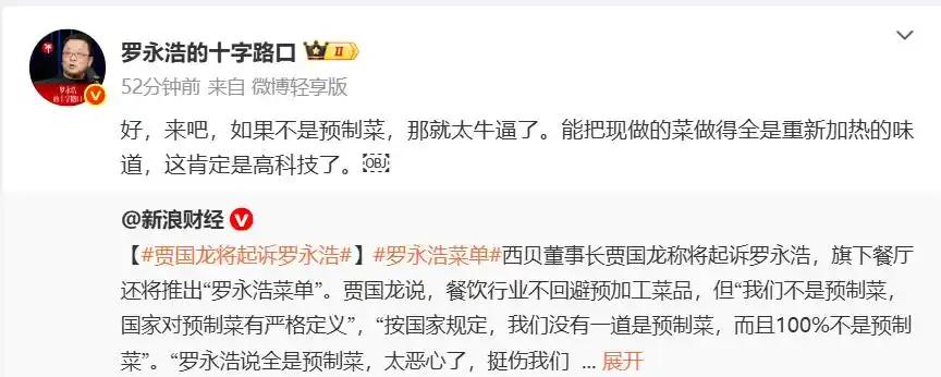 西贝这是咋了 怎么被老罗给盯上了 老罗在西贝吃饭 感觉味道不对 觉得吃了后是隔夜菜的感觉 然后就在自己的微博上质疑西贝的菜都是预制菜 这下可把西贝一下子送上了热搜 要知道,现在大家普遍对预制菜是比较抵制的 作为一个非常具有影响力的公众人物这么一说 西贝的形象可能就会被掉了一截 是可忍孰不可忍,西贝方面开始怼老罗了 说要起诉他损害西贝的社会形象与声誉 老罗这个老油条,也是久经沙场 直接回复西贝方面,好,开吧 意思是让西贝方放马过来,这是十分有底气啊 稍微关注他们这些人的都知道,老罗可是不好惹的 到底是西贝的菜有问题 还是老罗故意针对 我们拭目以待 大家有去西贝吃饭吗?真的是预制菜吗? 你们支持谁说的是真的