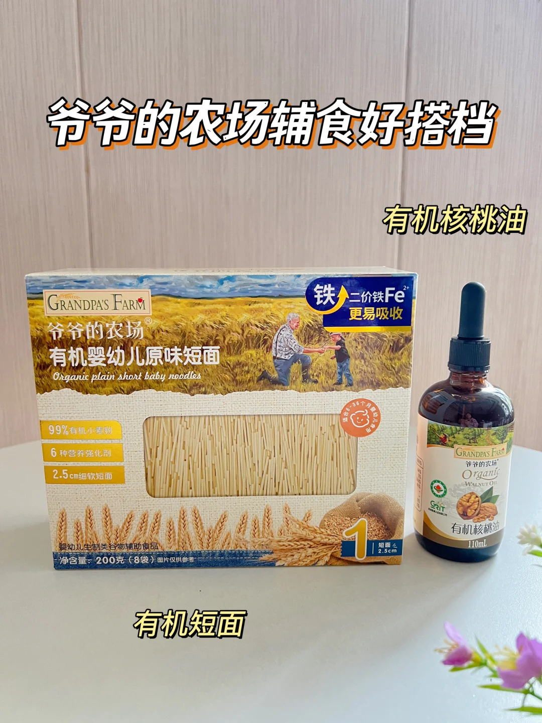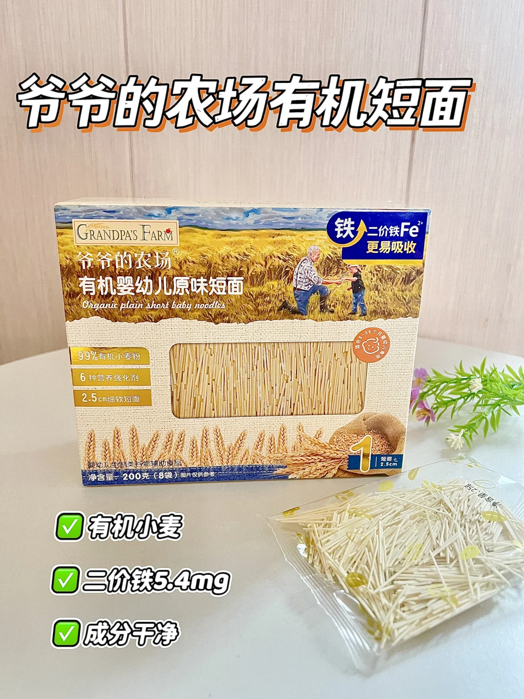 🧚🏻♀️我家宝宝从7月龄开始一直吃的这款宝宝面条是爷爷的农场有机面条,这款婴儿面条配料干净,单一谷物的有机小麦,不含其他过敏源、糖、盐等添加,适合宝宝小肚肚。富含钙铁锌等营养,而且是宝宝易吸收的二价铁配方,含量5.4mg,而且钠含量很低。