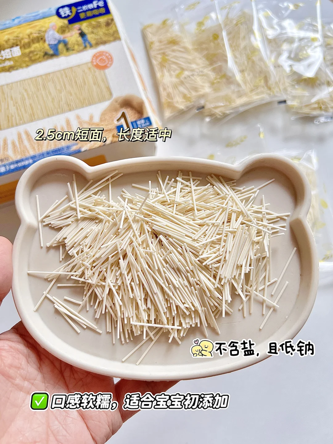 而且这款碎碎面易熟好煮,长度2.5cm可随意调整,口感软糯,适合宝宝初添加。里面都是独立小包装,一次一包,外出携带也方便。随时随地可以给宝宝做出好吃的辅食面条了😊