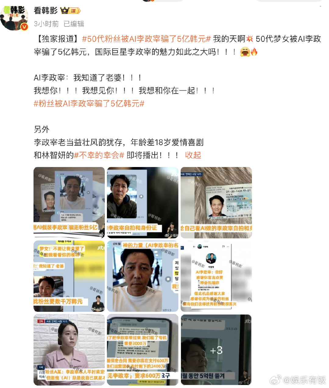 粉丝被AI李政宰骗了5亿韩元 据韩国媒体独家报道,近日一名 50 代女性粉丝遭遇 AI 诈骗,被伪造为演员李政宰形象的 AI 骗取 5 亿韩元(约合人民币 260 余万元),相关案件引发社会对 AI 深度伪造技术诈骗风险的讨论。
