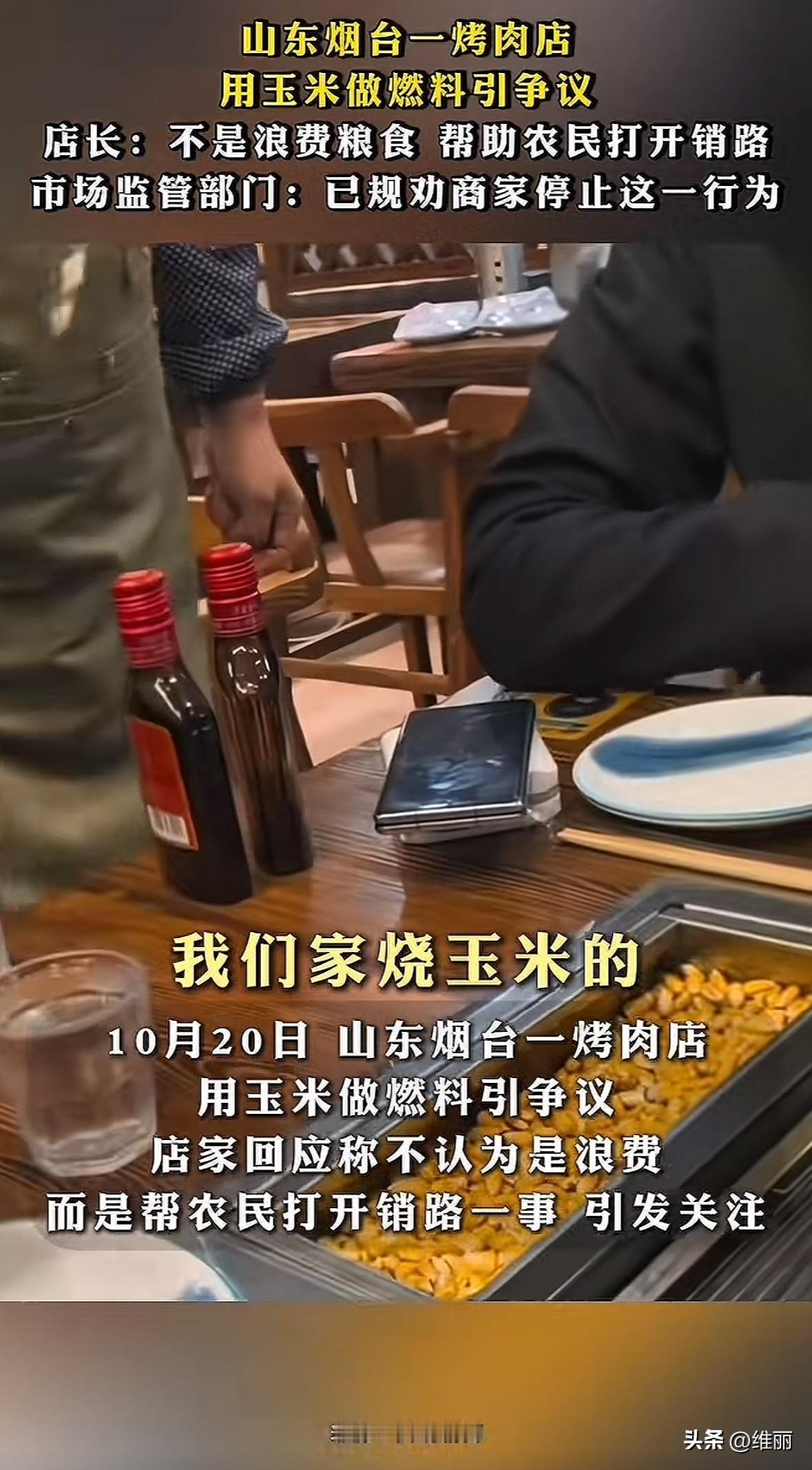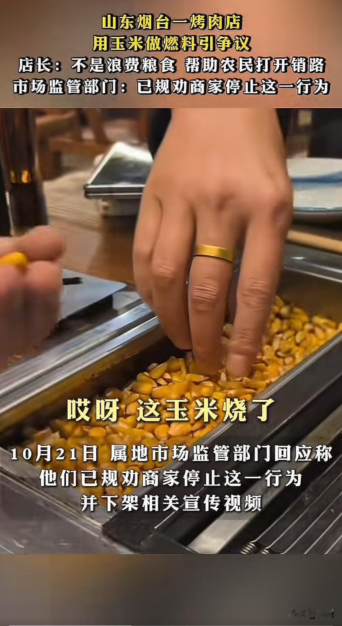 山东烟台林林烤肉店用玉米当燃料烤肉,这事引发不少讨论。 店家开了五六年一直这么干,说玉米更环保健康,采购的是周边农户的陈化粮,能帮农户拓宽销路。还拍了视频发网上。 网友吵开了,有人觉得这是浪费粮食,也有人认可帮农户增收的说法。 市场监管部门去查了,从厉行节约角度规劝店家停下,让下架宣传视频,店家答应整改。烟台市发改委也说了,当地玉米没滞销。 其实用陈化粮虽不是直接浪费口粮,但玉米作为粮食资源,有更高效的用途,比如饲料、工业原料。而且有专家提过,玉米燃烧不完全可能产生有害物质,反而不健康。节约粮食的共识得守住,商家想搞特色也得选对方式。