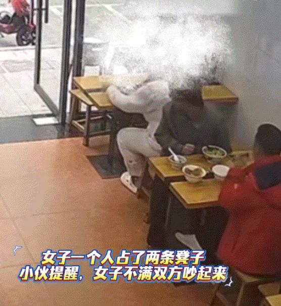 太过分了!10月20日报道浙江杭州,一女子在饭店用餐时,一人占了两人坐的凳子,导致与其背对背的小伙,被挤得都无法好好用餐,于是小伙就提醒了女子一下,不料这一提醒竟直接惹怒了女子。[无辜笑] 当时一位女士在调整自己椅子时向后移动过多,影响到了后方一位小伙子正常进出,小伙子开口提醒,不料对方情绪突然激动。 根据店内监控和现场画面,冲突瞬间升级,这位女士突然站起,将一碗还冒着热气的面条整个扣在了小伙的头上。 紧接着小伙和他同行的父亲立刻起身,合力将该女士推攘到了餐厅门外,双方在门口有短暂的肢体推搡,随后女士返回取走随身物品后离开。 餐馆员工在事发后迅速将双方隔开,防止了事态进一步恶化,店主事后表示,虽然日常经营中难免有摩擦,但如此激烈的冲突确实罕见,并对其他用餐客人造成了影响。 这起纠纷发生在背靠背的卡座区域,这种座位设计本身就需要前后顾客互相体谅,任何一方过度后仰或移动,都会直接影响到另一方的空间。 回顾这个过程,从言语争执到泼面再到推搡,前后不过一两分钟,如果最初的空间问题能由店员及时介入协调,或者双方能稍微克制情绪,结果可能完全不同。 遇到类似纠纷,更稳妥的做法是第一时间寻求店内工作人员帮助,而非直接与对方理论,让第三方来划定对错、调整座位,能有效缓冲对立情绪。 这也提醒我们,在公共场所活动,每个人的行为都在一定记录下,冲动之举不仅解决不了问题,还可能带来更大麻烦。 看了杭州面馆里发生的这事,真是让人又气又心疼那小伙子: “这根本不是占座小事了,泼热面就是故意伤害,必须报警追究责任!” “虽然动手不提倡,但那一刻当爹的护犊子是本能反应,可以理解。总不能眼睁睁看着自己孩子被欺负吧?” “店里肯定有监控,这就是铁证。希望小伙子别怕麻烦,坚决报警,让法律给她上一课。” “真想知道是谁惯出她这臭毛病的?在公共场所都这么嚣张,平时得横成什么样?” 如果你在现场目睹了全过程,你觉得在女子泼面之后,最好的处理方式是什么? 官方信源:浙江省公安厅门户网站