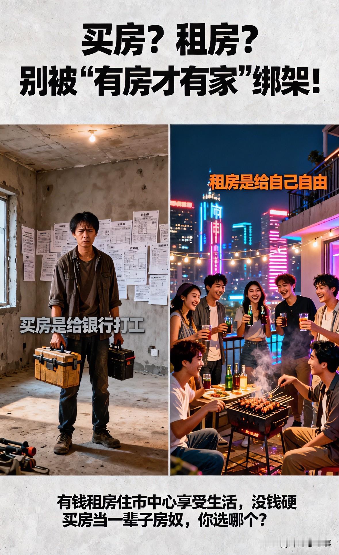 买房和租房你会如何选择“买房租房?别被世俗观念pua了!买房是给银行当长期打工人,租房是把钱花在刀刃上享受当下。有钱租个市中心的好房,逛街通勤都方便;没钱非要买房,背三十年房贷当房奴,天天吃土不敢消费,图啥?我选租房,把自由和生活质量牢牢抓在自己手里!”[灵光一闪]