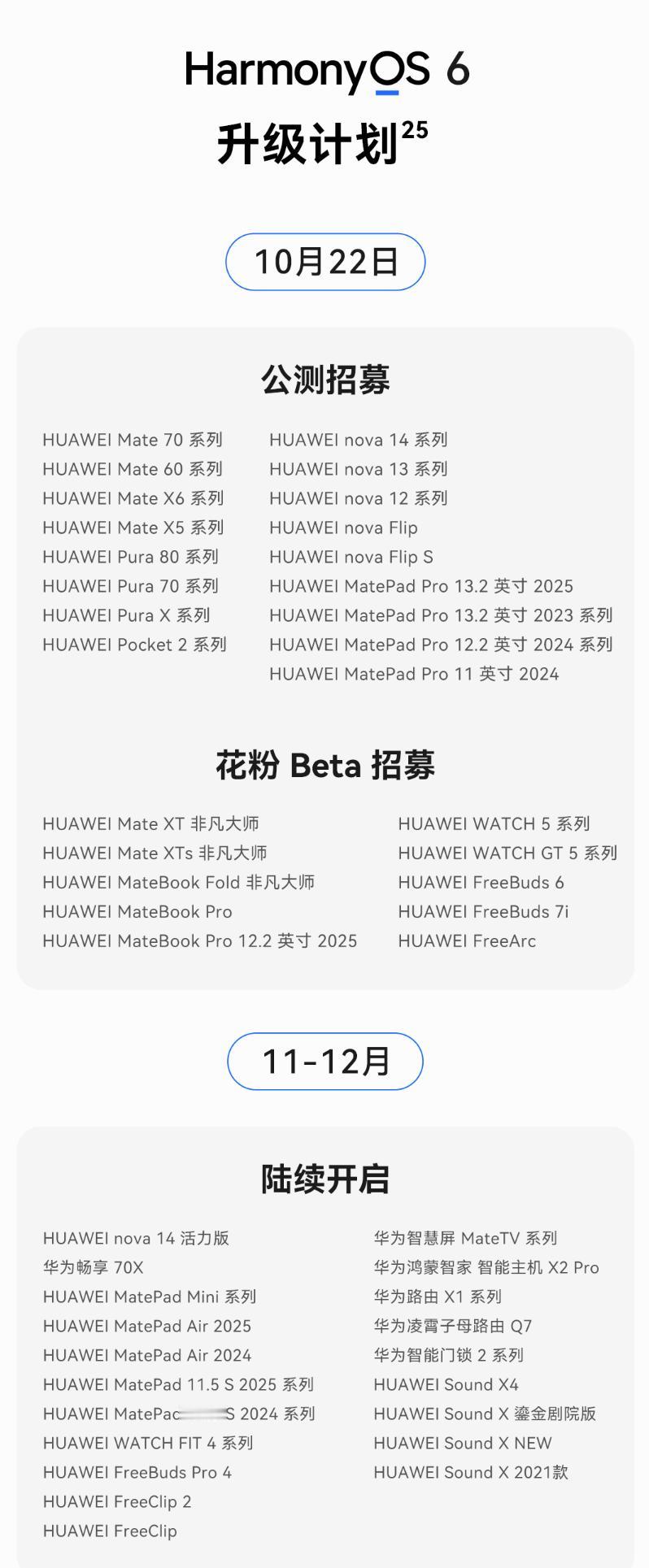 华为放大招!鸿蒙6升级机型一览。 今天开始公测招募,在我的华为里申请一下。想快人一步的,查看下“升级尝鲜”。 很多Mate60系列、甚至Mate40系列用户在问,我觉得还是慢慢等吧,之前余承东说能升级,相信!