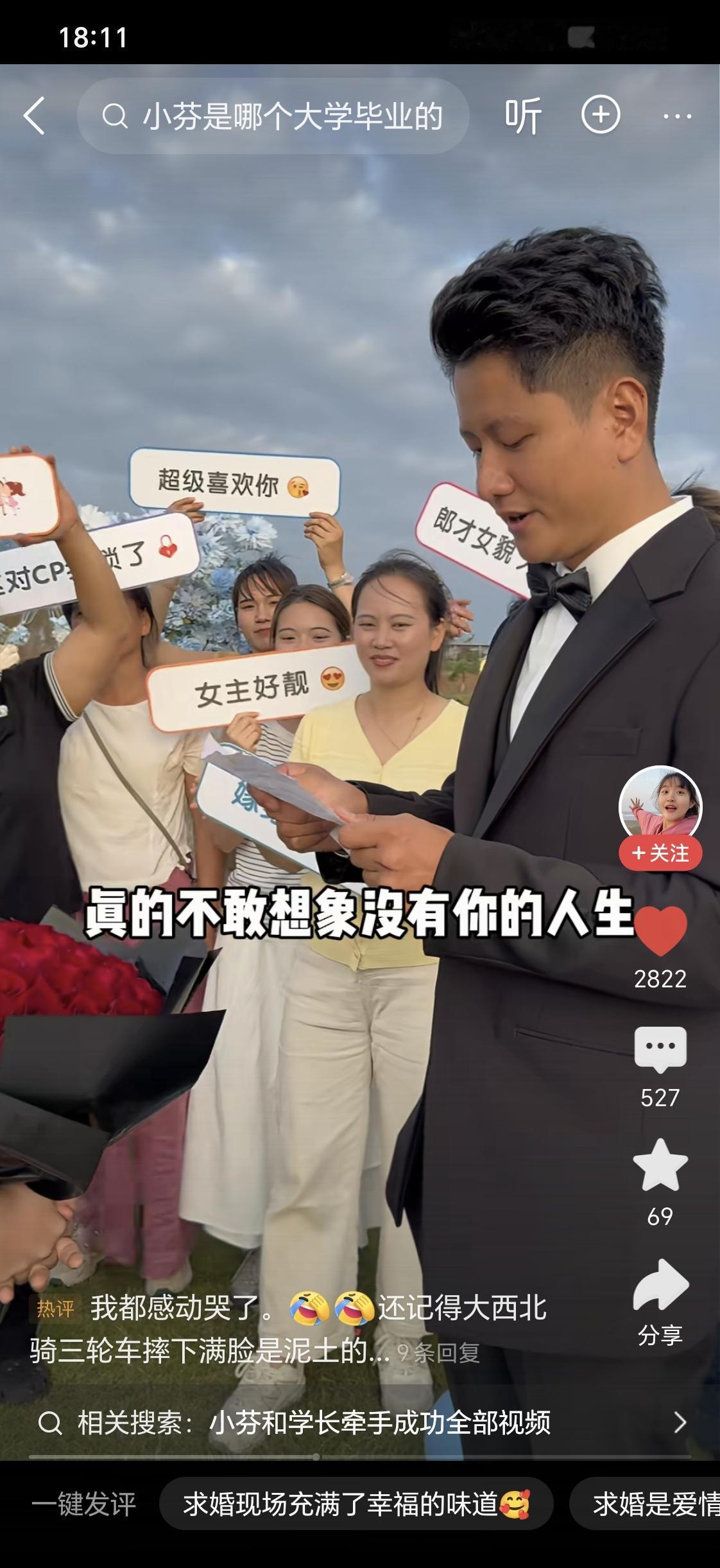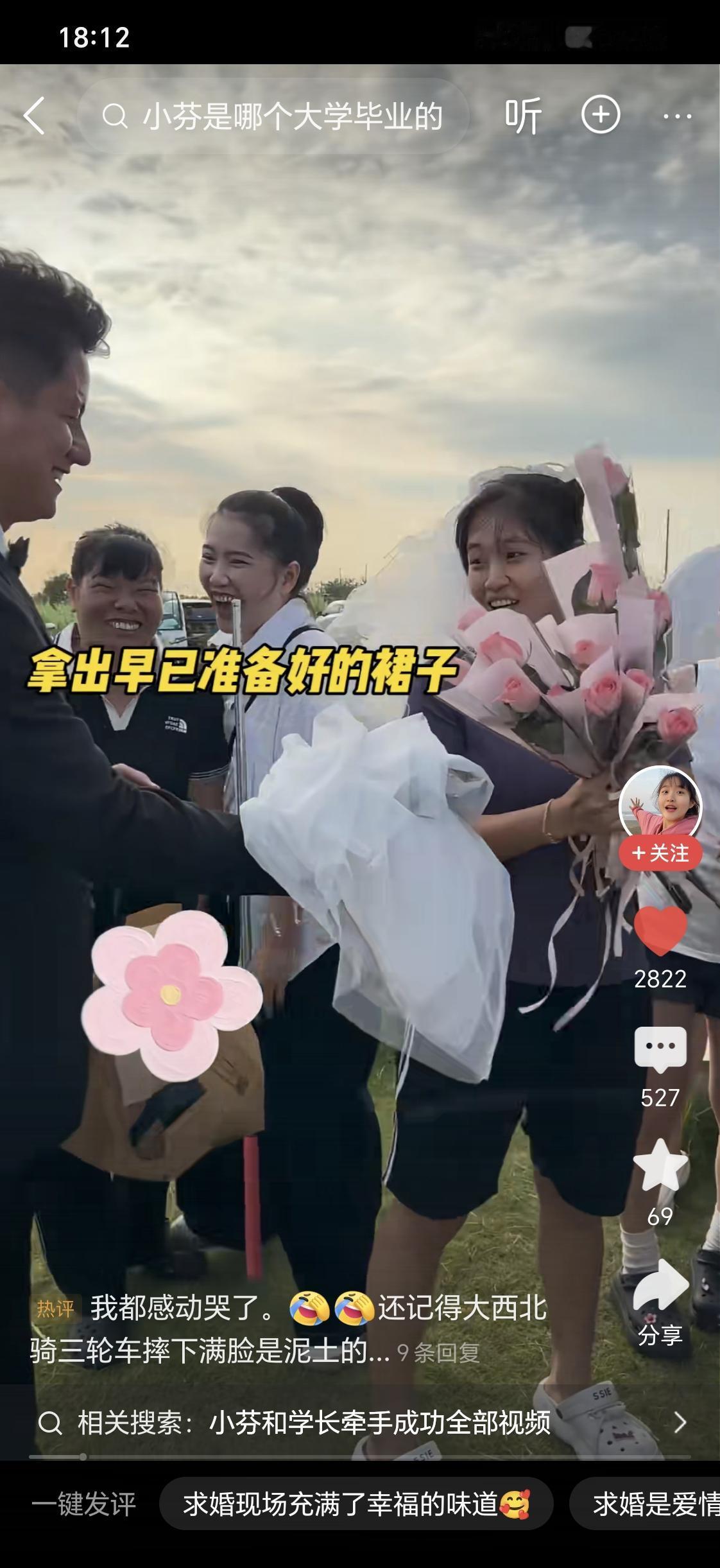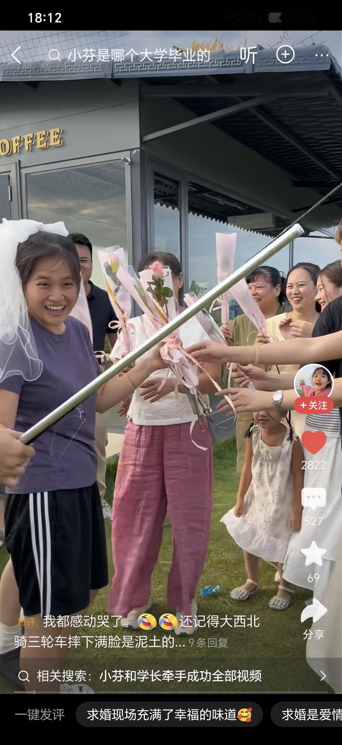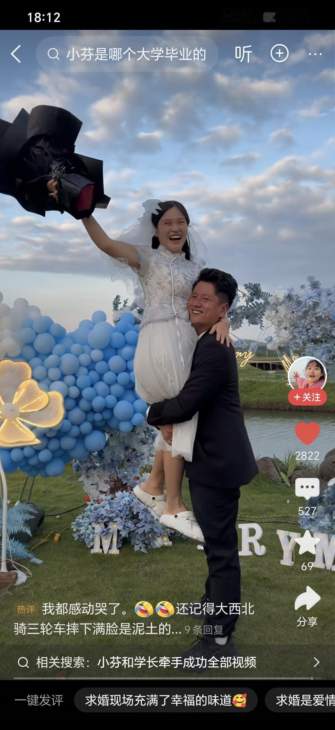 求婚太甜了,有仪式感就是对爱情的尊重[捂脸][比心][比心][比心]大网红的爱情要结果了。 湛江学长向潮汕小芬求婚。 学长偷偷带家人准备, 瞒着以为来钓鱼的小芬, 把小芬带到精心准备的场地。 小芬收到亲人团的玫瑰花, 换上新裙子, 穿上洞洞鞋[捂脸]收下了学长的金戒指。 现场放烟花, 学长紧张又动容地念完稿子, 现场人又激动又哭又笑,都为学长加油, 为学长和小芬的求婚加油! 我都看泪目了。 这样甜甜的感情真好嗑!求婚 学长求婚 潮汕人求婚