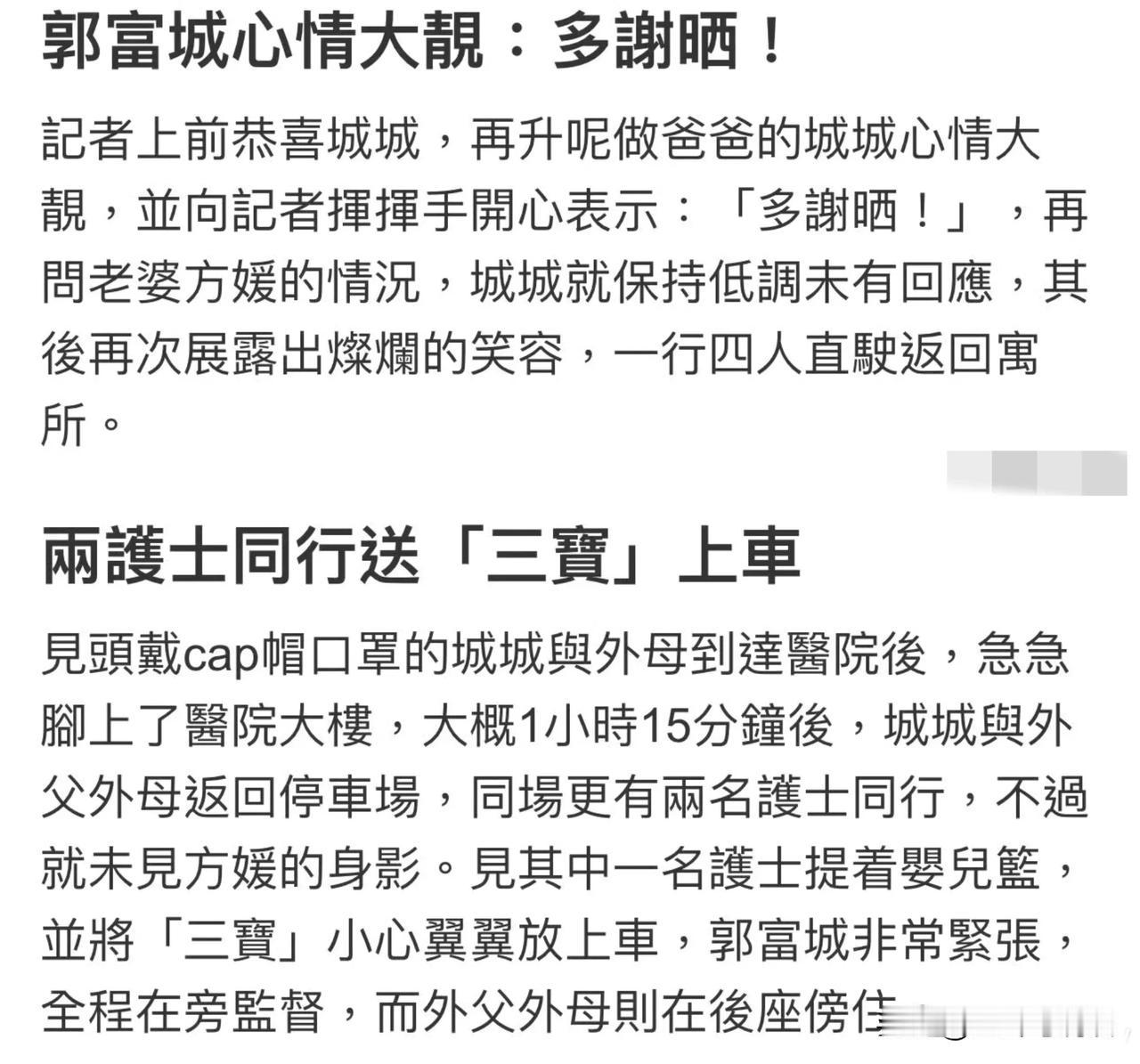 生了!方媛郭富城的三胎这次真的生了!这把可把郭天王激动坏了,竟然亲自开车,在香