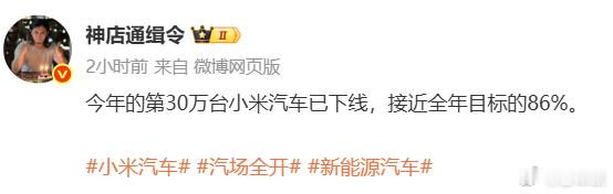 10月22日,有微博大V发文称,第30万台小米汽车已正式下线,完成率接近86%。