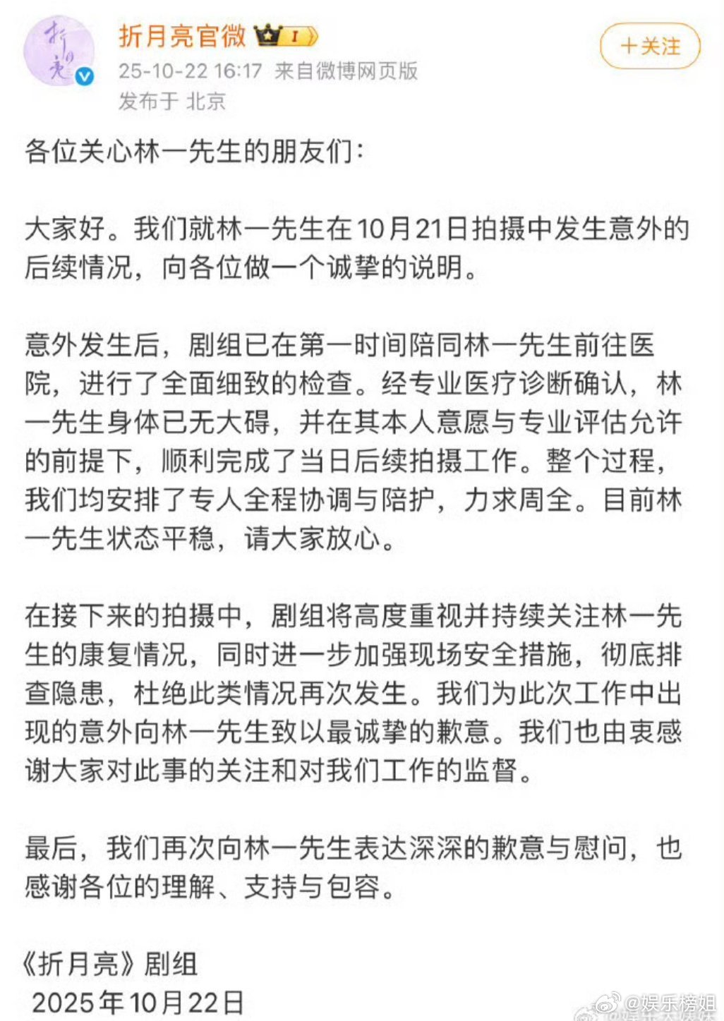 折月亮剧组发文向林一歉意 针对林一在拍摄中意外受伤一事,《折月亮》剧组于今日下午发文回应,称其目前状态平稳。剧组向林一表达了深深的歉意与慰问,并表示将重视场景安全,同时感谢各方的理解与支持,祝愿林一早日康复。