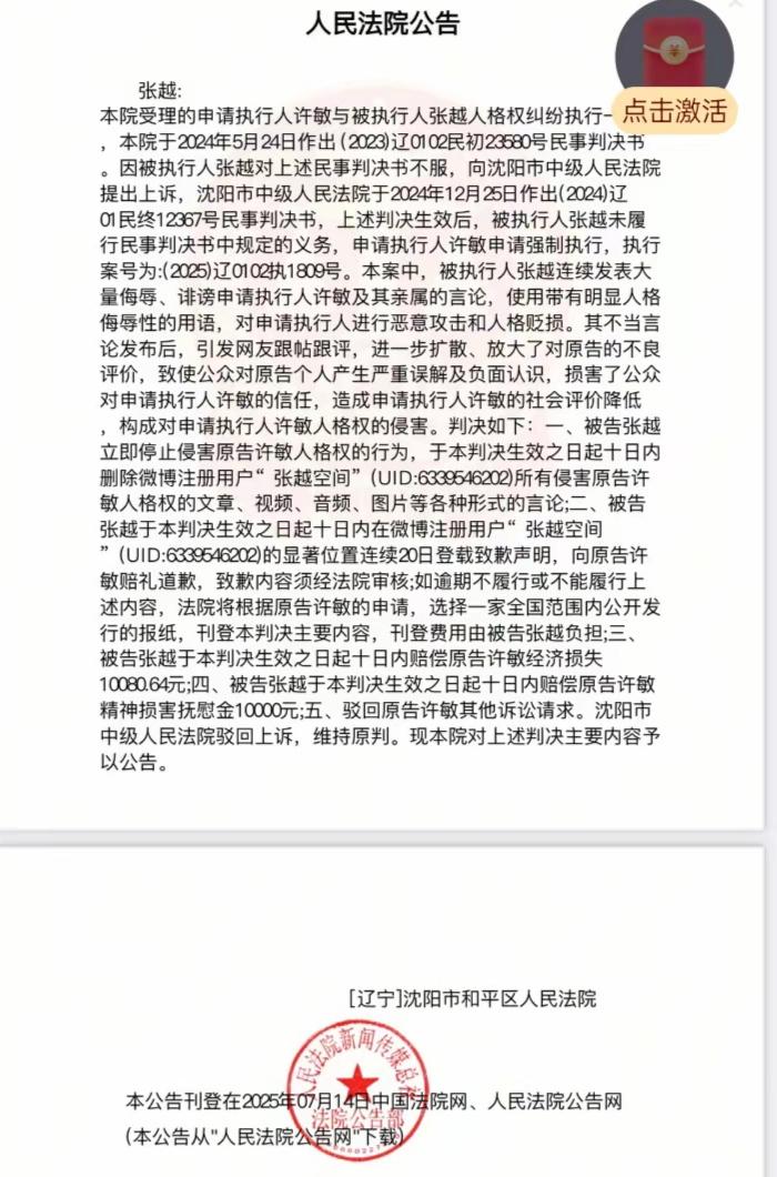 许妈反网暴又赢了 这次输的人名字叫张越,非大媒女主持人,是一位东北的男性老者,他的账号叫“张越空间”,因侮辱诽谤许妈被诉。 这位老哥第一次开会输了,他不服气,向上走了一步,让二婶子一脚踢回来了,还不老实,又被强制执行,这回老实了。 决决书显示了四条,均为决决书生效十日内执行。一,老哥删除侵权的文章,视频,音频,图片。二,给许妈赔礼道歉。三,赔偿许妈经济损失一万零八十元。四,赔偿许妈精神损害抚慰金一万元。 骂人是无知无能的表现,这回老哥该长记性了,希望豆粉们回头是岸,别跟着架秧子起哄了,到时候吃不了兜着走,可是得不偿失。
