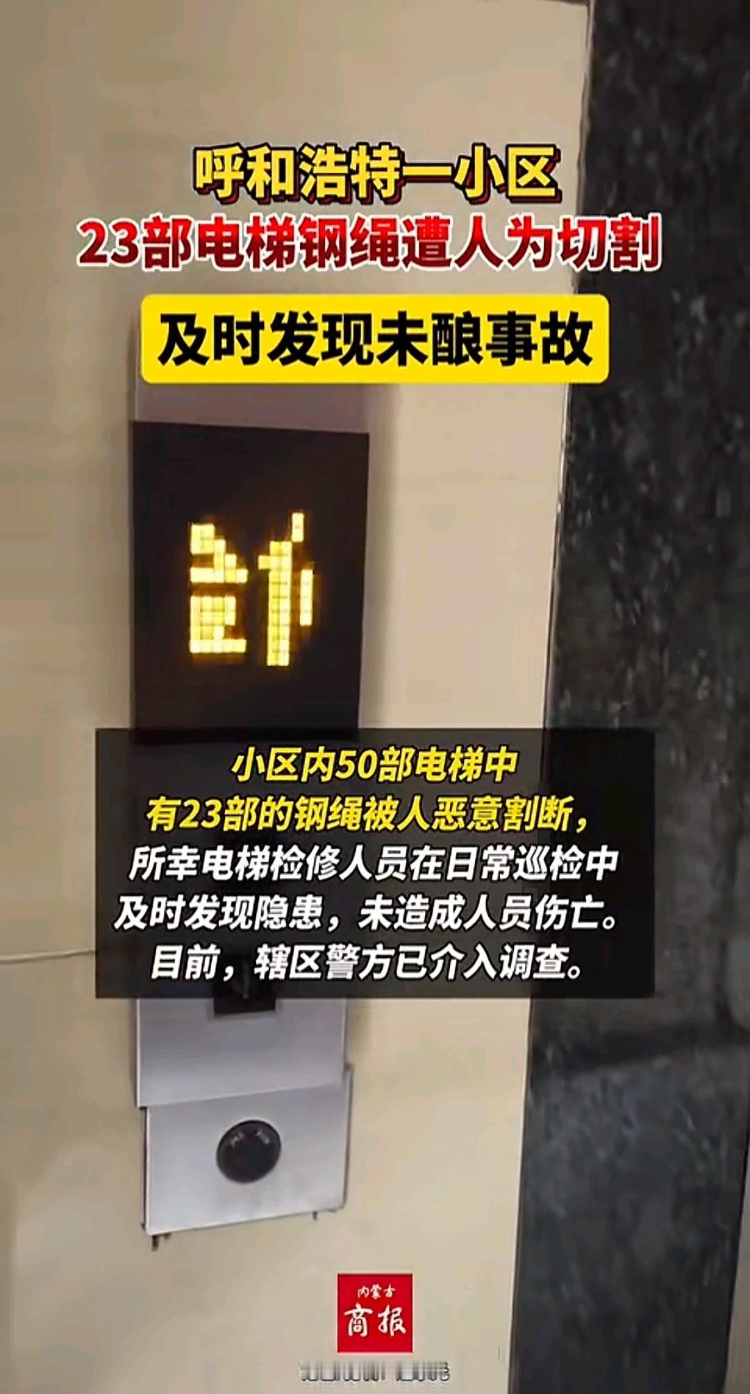 小区内50部电梯中 有23部的钢绳被人恶意割断 寒光划开的哪里是钢绳 是整栋楼老少的活命底线 几根细索牵着的不是轿厢 是上百号人的朝夕安危 敢在居民眼皮子底下动黑手 要么是揣着坏心思的内鬼 要么是藏着毒心肠的疯子 每一刀都往人命上扎 没出事儿算捡着天大的幸运 可不是每次都能撞上负责任的检修 万一哪个老人带着孩子按下按钮 就是一整家的灭顶之灾 别扯什么矛盾纠纷 再大的仇怨也别拿公共安全撒野 这不是泄愤是赤裸裸的犯罪 今天敢豁开电梯钢绳 明天就敢拆楼里的燃气管道 查!必须往死里查 揪出来让他尝尝法律的重拳 也给那些藏着坏心眼的人提个醒 小区里的每一寸安全 都容不得半点亵渎 这种踩着别人性命的恶 难道还能轻饶吗