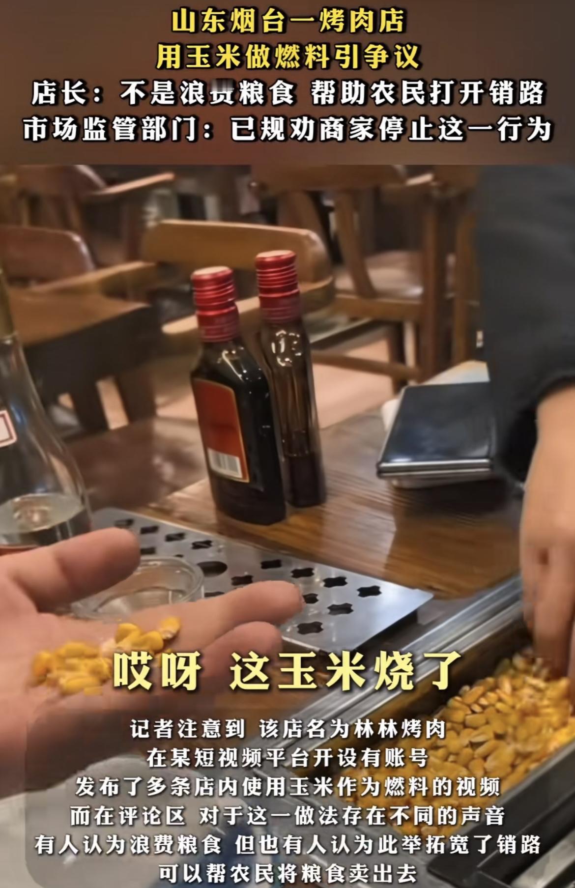 烤肉店用玉米做燃料引发争议! 看到一个视频, 山东烟台某烤肉店,因为使用玉米作为燃料,引发争议,店家表示,本是好意,帮附近农民打开销路! 怎么说呢, 玉米可以做成酒精给汽车加,和直接当燃料烧, 没有本质差别吧, 农民种地愁销路, 店家买来做燃料, 也应该是一种双赢吧? 不禁想起以前那件事, 挑山工把狗抬上山, 也不累,还赚了钱; 狗主人自己省了力气; 无关网友暴怒了: 侮辱人! 农民玉米卖不出去,店家成本降不下来,是好事么? 您怎么看这件事儿呢? 农民 玉米 烤肉店用玉米燃料 圣母