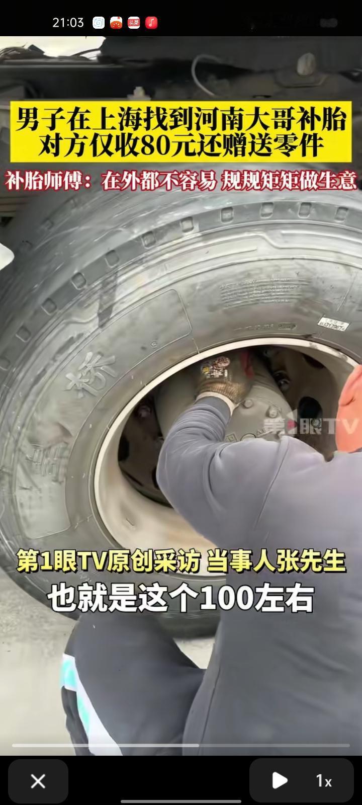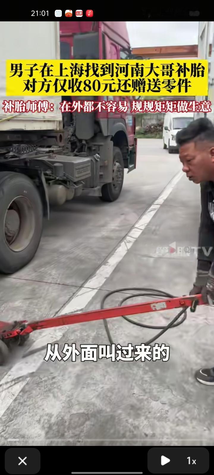 10月20日,上海。男子找到河南大哥补胎,对方仅收80元还赠送零件。当事人张先生说:“很多跑卡车的司机都知道,出门在外就怕被宰客,大哥说了句实实在在做人,规规矩矩生意打动了我。”。他还称,平时移动补胎要200元左右,这位河南大哥要价良心,人也特别朴实。 补胎师傅也表示,人都有困难的时候,不要狮子大开口,在外不容易,大家互相互助吧。