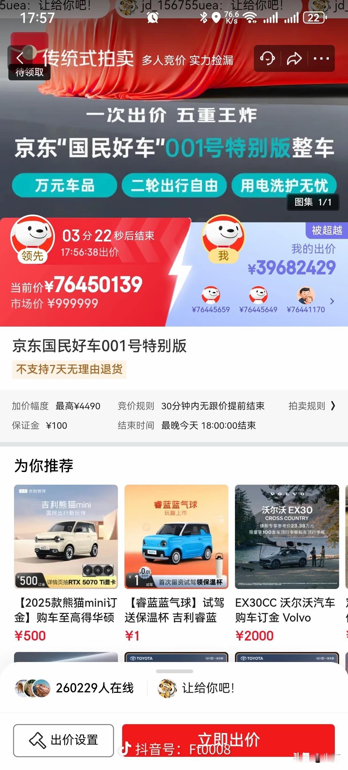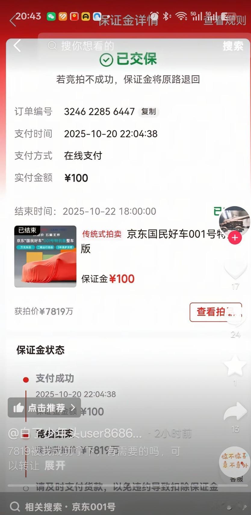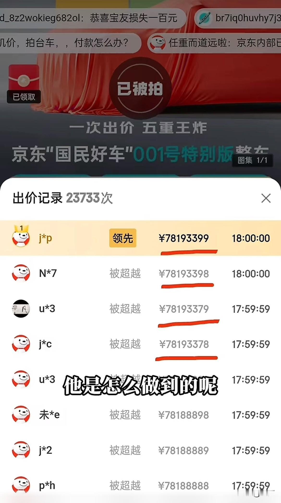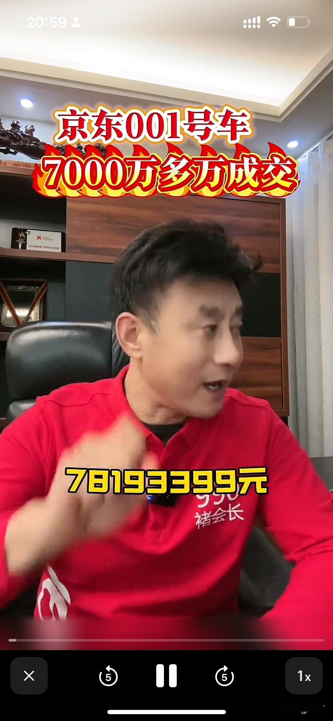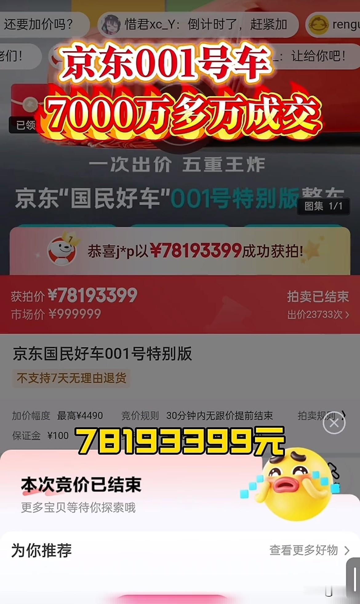 褚会长:京东1号车,最终的价格出来了,78193399元成交! 今天晚上,一直在参与这场拍卖的褚会长,专门发了一条视频,给大家介绍了这次京东拍卖他们的壹号车的整个过程! 从一块钱开始拍5分钟之内就飙到了上千万的价格,这个理论上价值只有十多万块钱,但是参与的人太多了,可能很多人都想把这个车拍下来,做为纪念! 所以这一场拍卖可能是这么多年以来出价最多的人,因为有好几十万人真的付钱参加了! 当然,这些人当中也包括褚会长,他多多少少还是想再复制一下去年参加周鸿祎迈巴赫拍卖的辉煌时刻,但是这一次的价格要比他上次高的太多了,所以他还是没有扛住! 而且最终能够用这个价格拍卖下来的人还是有水平的,他是在第二名的基础上,下了一块钱就把这个事情搞定了! 其实他最终的代价是很大的,因为不管怎么样,这个拍卖成功了他就得付钱,要知道,能够一次性拿出7800百多万现金的人,那可不是吹牛的! 但是目前还没有任何人知道这个拍卖的最终得主到底是谁,所以褚会长也专门在网上发视频寻找这个真正的得主! 他想从这个车主手上,把这个车买下来,不知道人家会不会愿意[捂脸]