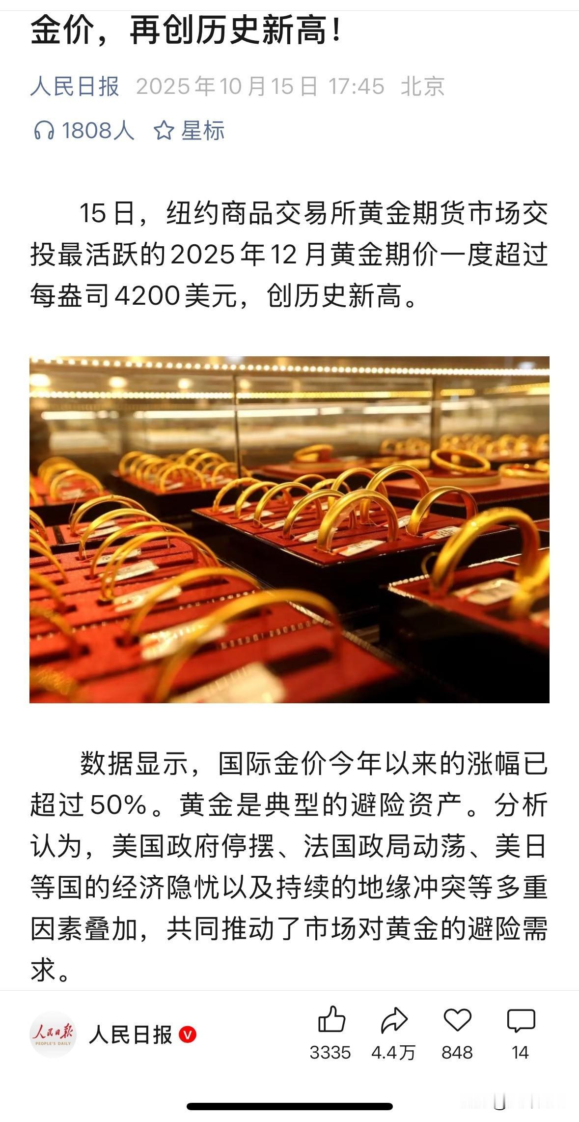黄价大跌消息冲上热搜?还记得七天前10月15日人民日报才发文称金价再创