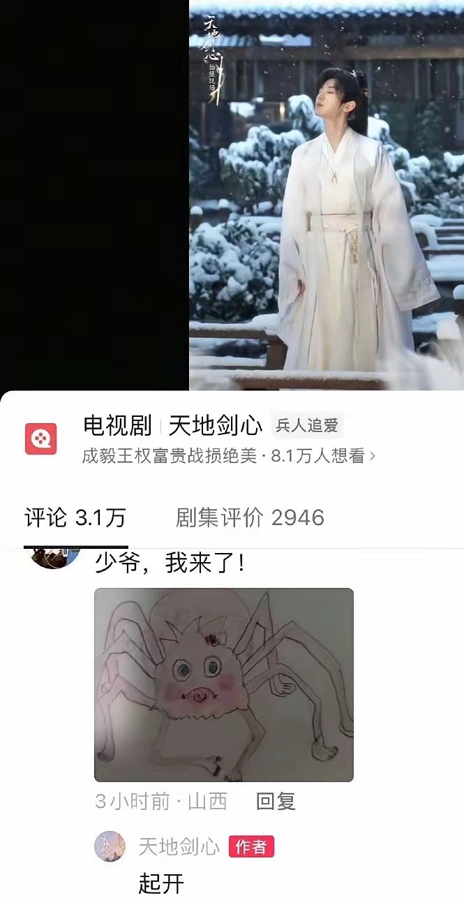 网友看到成毅王权富贵的花絮,被富贵少爷迷得不要不要的,想着富贵少爷不是喜欢蜘蛛精吗?那自己就画个蜘蛛精吧,还配文:“少爷,我来了!”