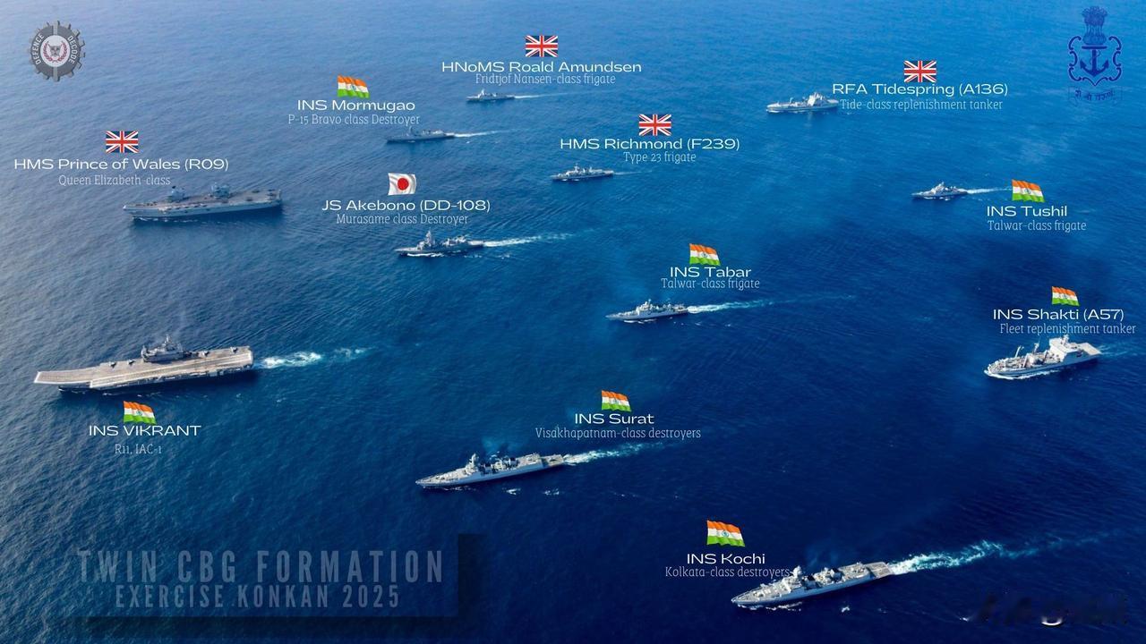 阿三磕头航母领衔,“康坎-2025”英印双航母演习编队震撼出场。 2025年10月,英印在阿拉伯海举行该双边演习,首次实现双航母协同——英国“威尔士亲王”号与印度“维克兰特”号(国产首艘航母)为核心,英、印、日、挪十余艘驱护舰、补给舰组成编队。 作为英印2004年起的例行演习,本次强化了双方印太军事合作,也展示了印国产航母实战效能与英航母全球部署能力,后续英编队还访问了印度港口并开展防务交流。