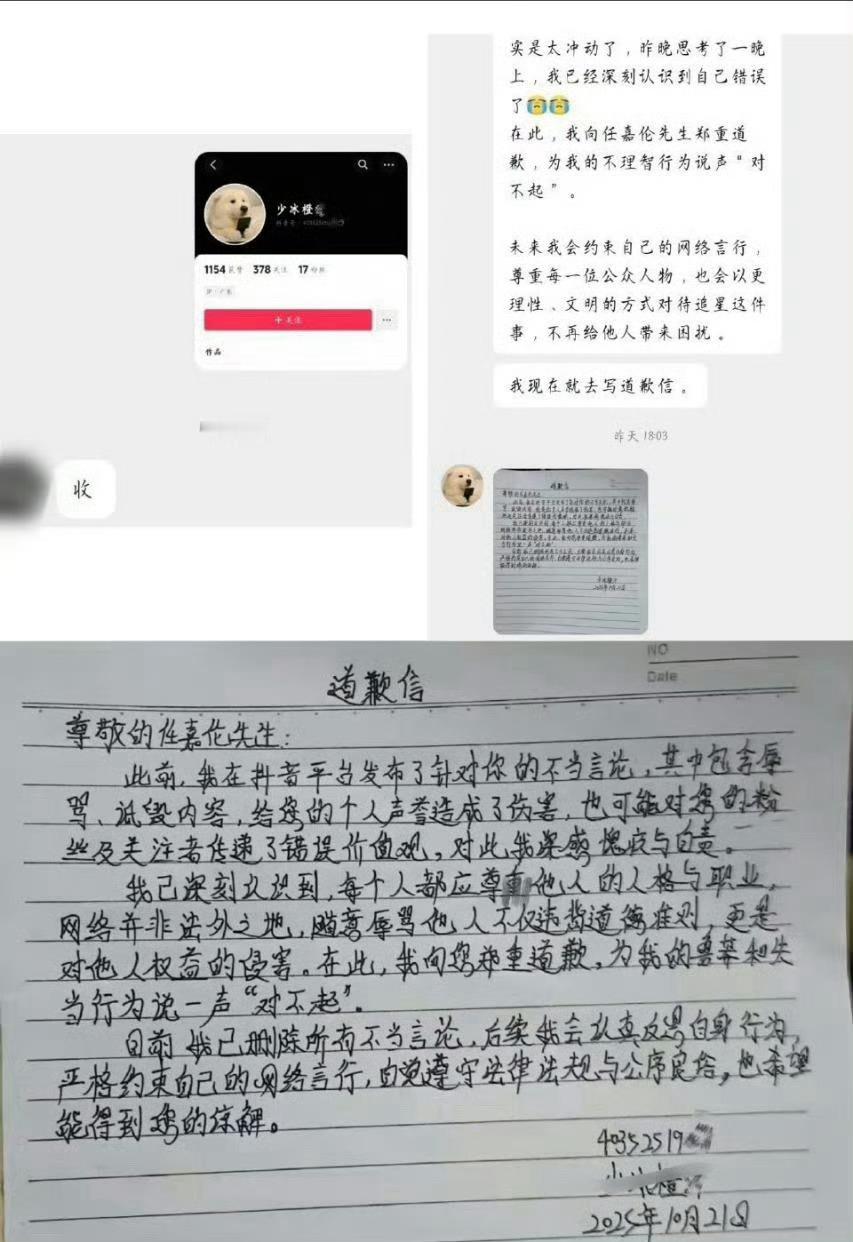 NBA线下活动后续,任嘉伦粉丝陆续收到王俊凯粉丝的手写道歉信,看来这波嘉人姐姐坚持要维护自己利益了,网络不是法外之地,追星也要谨言慎行!