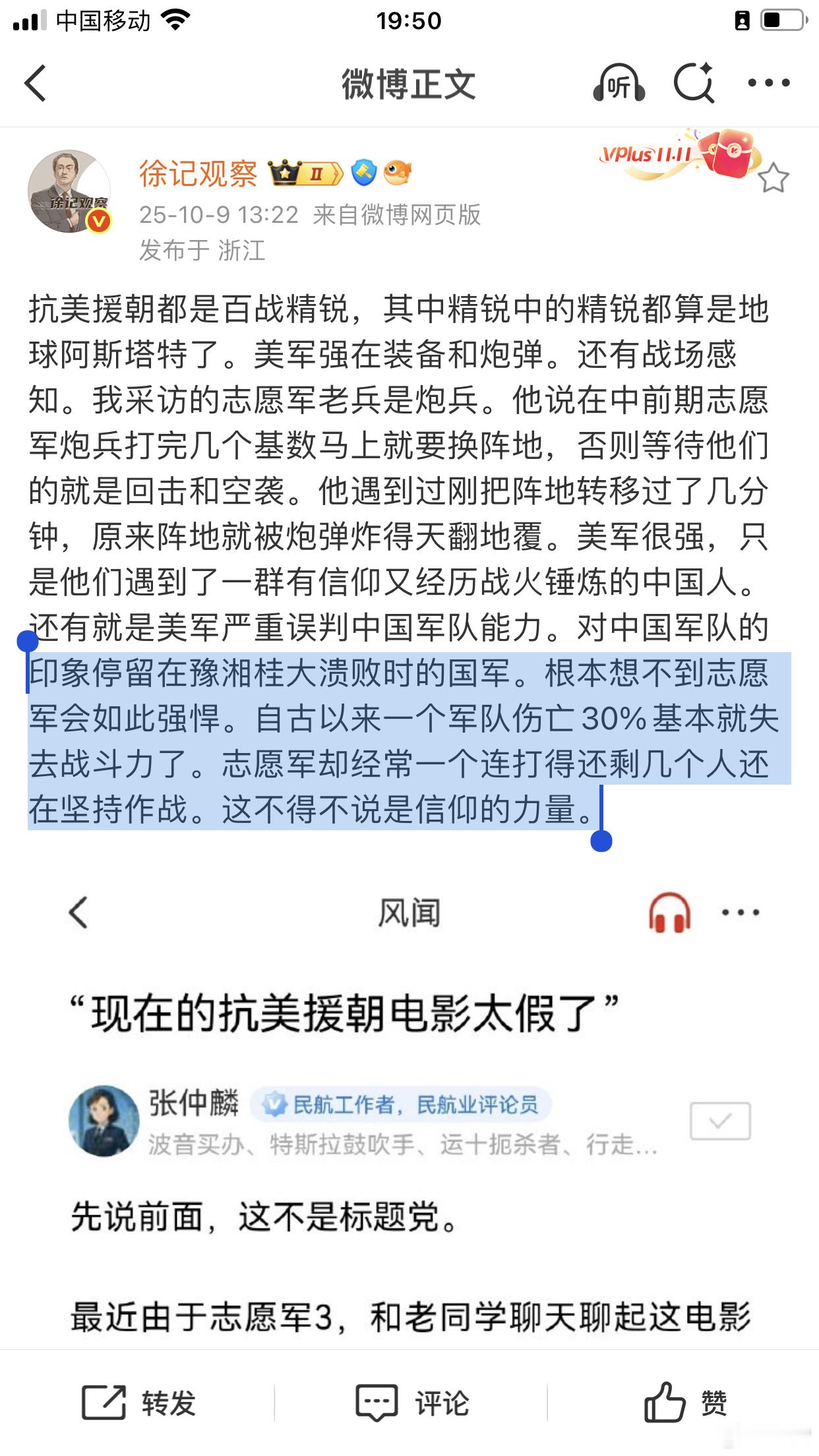 现在的抗美援朝电影太假了——美国对中国军队的印象还停留在豫湘桂大溃败时的国军。根本想不到志愿军会如此强悍。自古以来一个军队伤亡30%基本就失去战斗力了。志愿军却经常一个连打得还剩几个人还在坚持作战。这不得不说是信仰的力量。