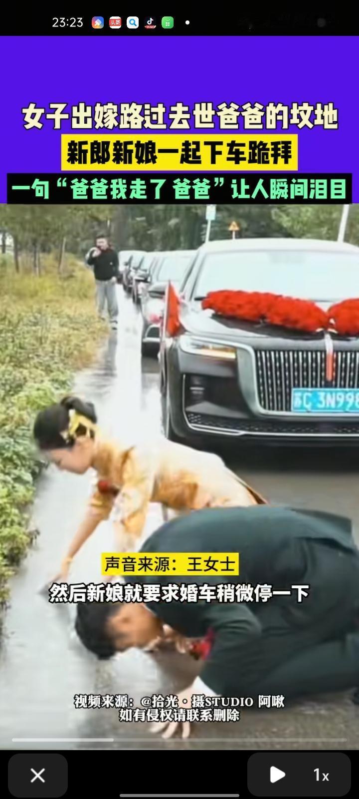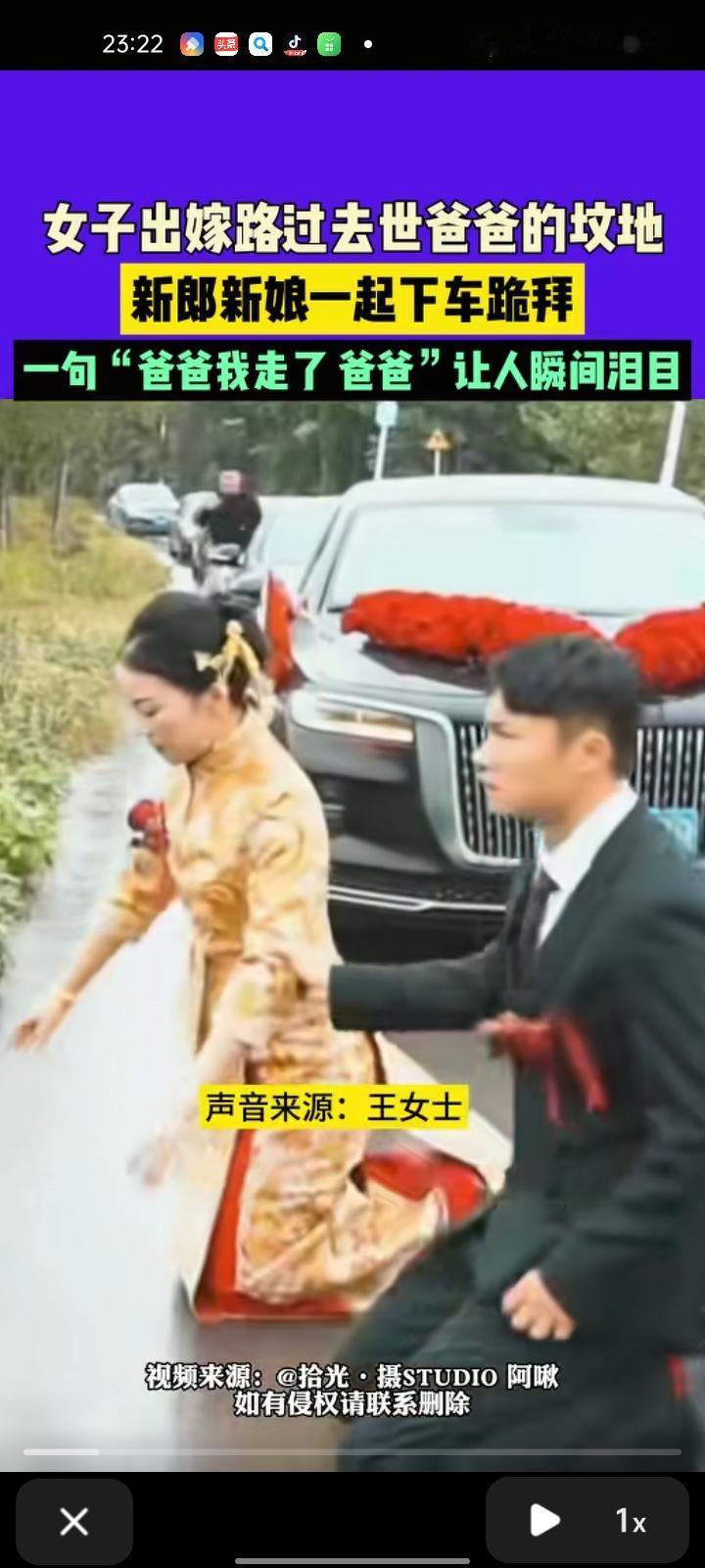 10月21日,江苏徐州。女子出嫁途中路过已故父亲的坟地,新郎和新娘一起下车跪拜,如果父亲在天上看到后一定会欣慰。磕完后,新娘就说“爸爸,我走了,爸爸”。 视频拍摄者王女士表示,当天下了很大的雨,看了这个场景心里特别难受,又很心疼新娘,同时又被她这种行为感动到了。