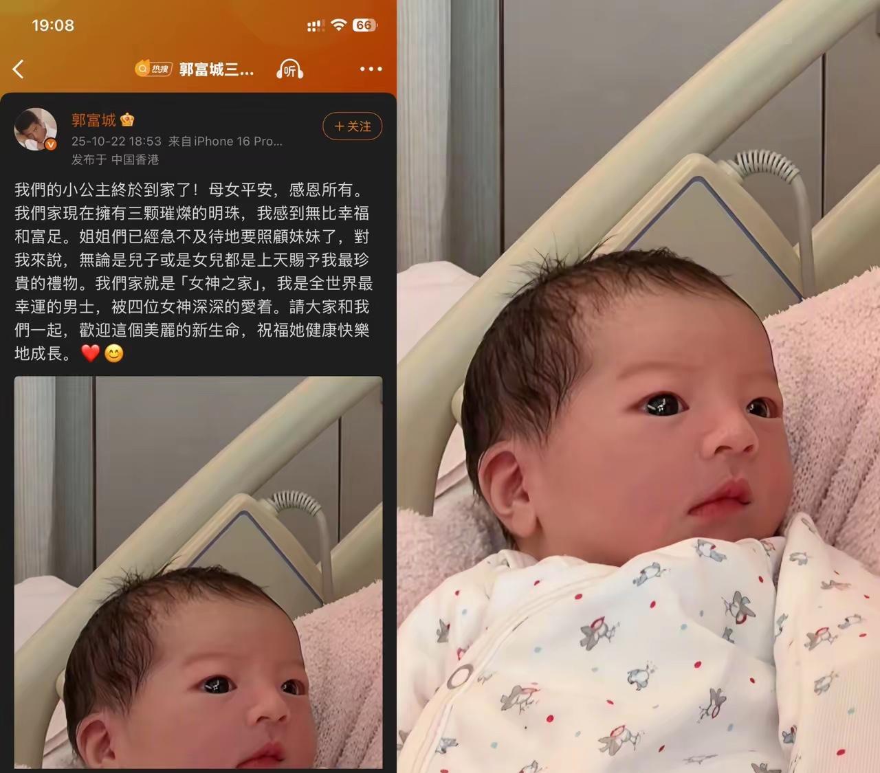 我猜过郭富城想要凑个“好”字, 也猜过他肯定盼着老来添丁热闹, 但让我万万没想到的是,他居然真如自己所说,不论男孩女孩他都喜欢,都是自己的孩子,没有任何偏心。 人家三胎生了女儿,直接发微博喊“三颗明珠”“女神之家”,把欢喜写满了屏! 你看他那文案,“无论是儿子或是女儿都是上天赐予最珍贵的礼物”,这话以前听着像客套,现在结合他晒娃的劲头,突然就信了。 没藏着掖着,也没半点“没生儿子”的遗憾,反而把小女儿宠成了家里的新宝贝,连姐姐们都急着要照顾妹妹,这氛围谁看了不说句“是真幸福”! 你们觉得,郭富城这种“不论男女都疼到心坎里”的态度,是不是给不少纠结“生男生女”的家庭上了一课?