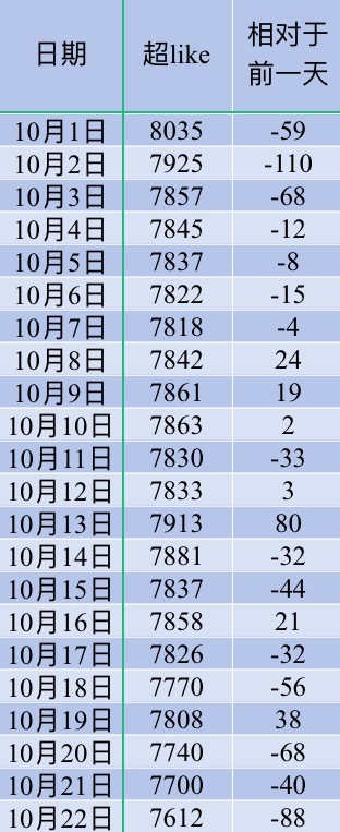 咱们昨天的超喜欢和发帖人数又是稍微的下降了一丢丢,今天的超喜欢底数跟前一天刚好持平