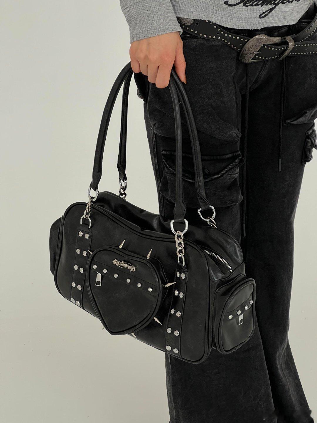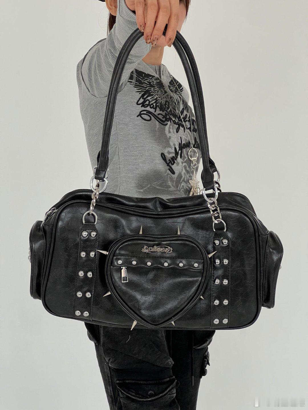 这款单肩包是朋克风格的个性宣言。黑色皮质包身气场十足,装饰其上的银色铆钉与尖刺带来不羁的摇滚气息。心形小口袋与金属拉链兼具实用性与装饰感,垂坠的金属链条和星星挂饰进一步强化了其酷炫不羁的独特格调。整体设计大胆鲜明,完美适合追求与众不同、渴望表达强烈自我风格的时尚人群。时尚配饰