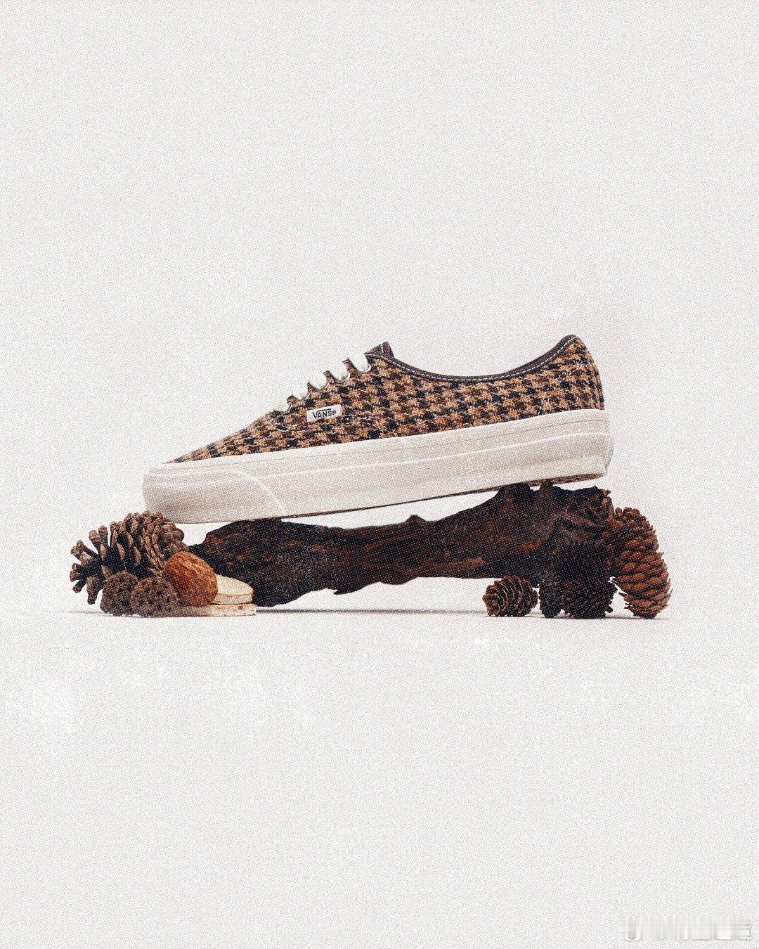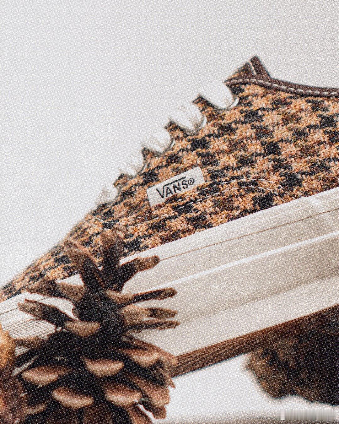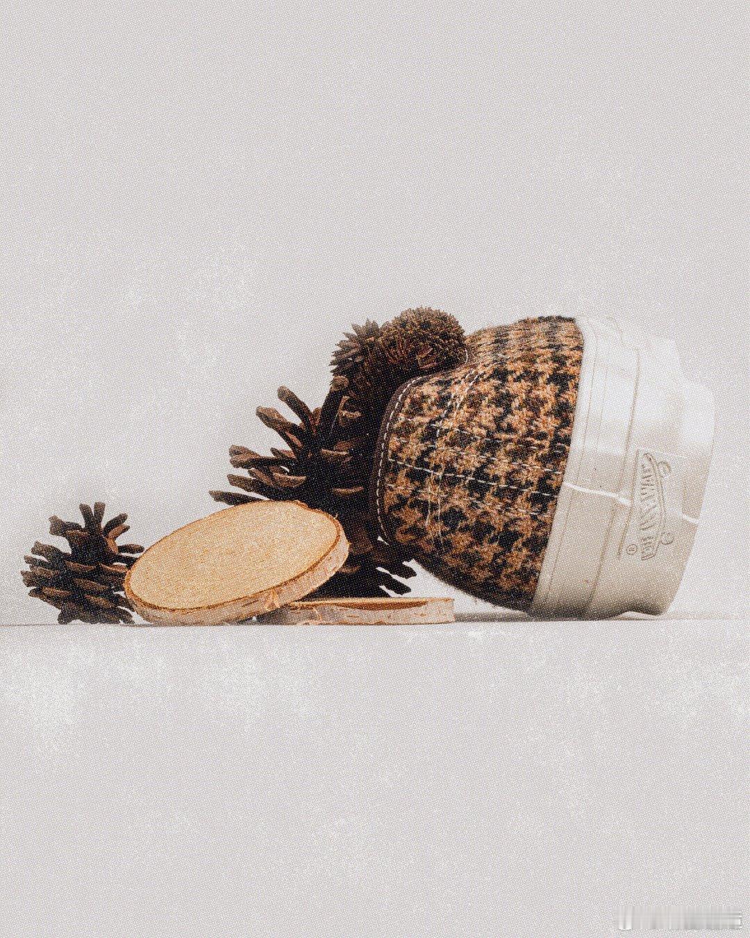 这双Vans板鞋以标志性的千鸟格图案打造出复古时尚气质。棕黑交织的帆布鞋面充满视觉张力,搭配白色橡胶鞋底与鞋带,形成经典撞色效果。鞋舌上醒目的红色"VANS"品牌标识成为点睛之笔。鞋子被精心摆放在粗犷的深色树干上,周围散落的棕色松果与鞋面色调呼应,巧妙构建出自然与街头文化交融的视觉叙事。厚实的包边设计延续品牌经典工艺,整体既保留滑板鞋的街头基因,又通过千鸟格元素注入英伦雅痞风格,展现出别具一格的混搭魅力。时尚鞋履