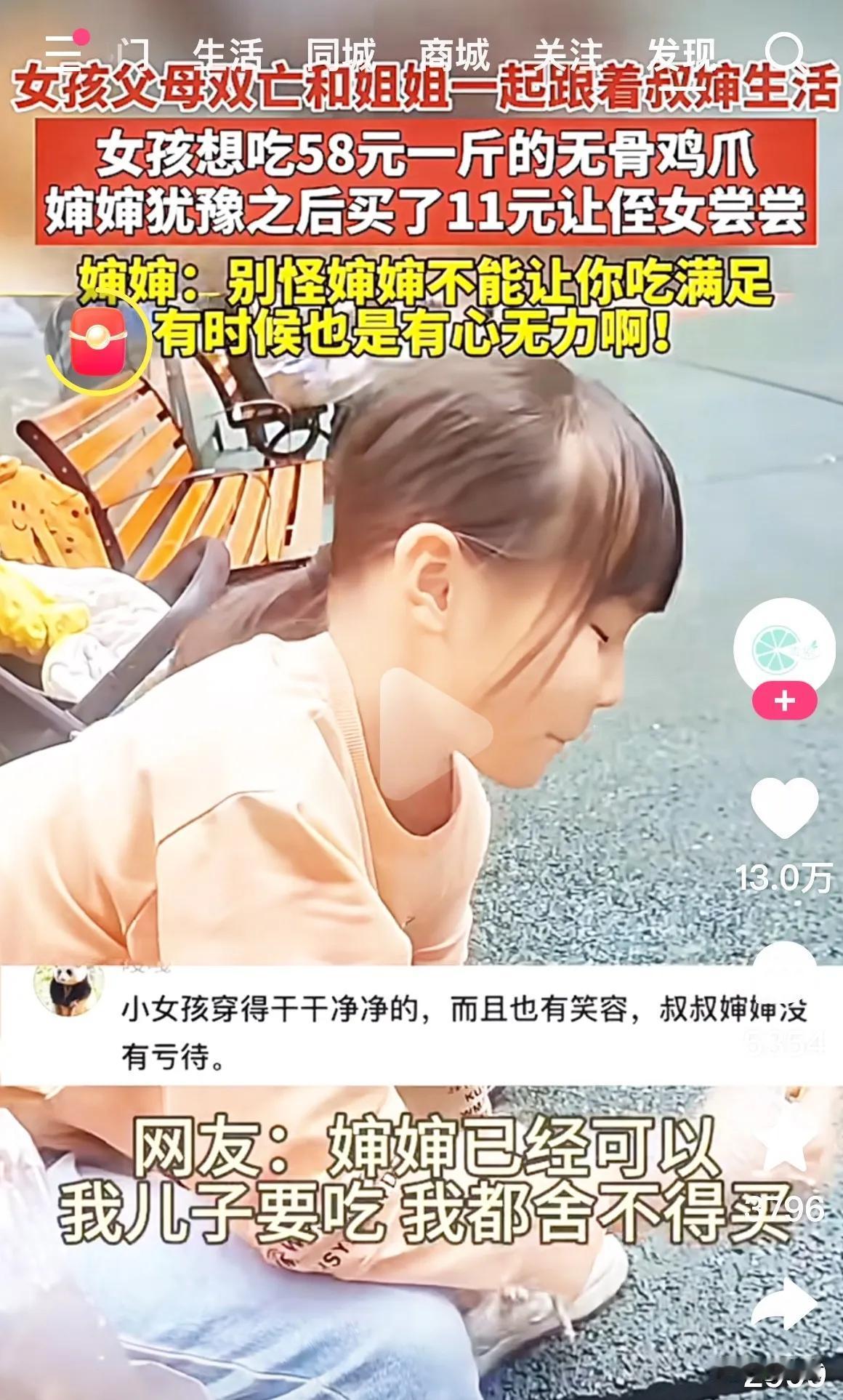 爱有天意! 女孩父母双亡和姐姐一起跟着叔婶生活。女孩想吃58元一斤的无骨鸡爪,婶婶犹豫之后买了11元让侄女尝尝! 婶婶:别怪婶婶不能让你吃满足,有时候也是有心无力啊! 网友说: 作为一名局外人,很能体谅婶婶的不容易,当年我女儿才一岁,就是由姑妈,外婆,大姨妈轮流帮带大的,所以特别能理解你们的不容易,所以我经常教育我女儿,在爸爸妈妈特别艰难的那几年里,一定不要忘记带大你的人。 婶婶有大爱,自家也有孩子,还收留老公哥哥家两个孩子,我感觉那个小女孩很不懂事,58元一斤也敢吵着要吃,可见叔婶对她们有多好。 58元一斤的无骨鸡爪,相信很多人自己家的孩子想吃都不舍得买,这叔婶已经很不错了,大爱