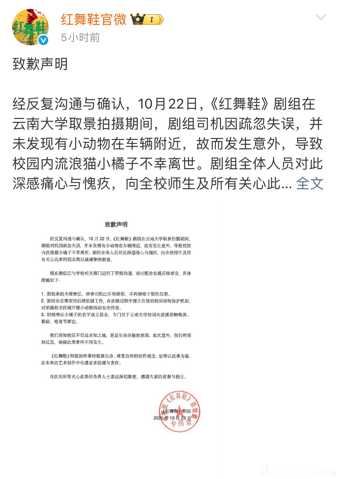 剧组司机在云南大学不慎撞死流浪猫道歉声明