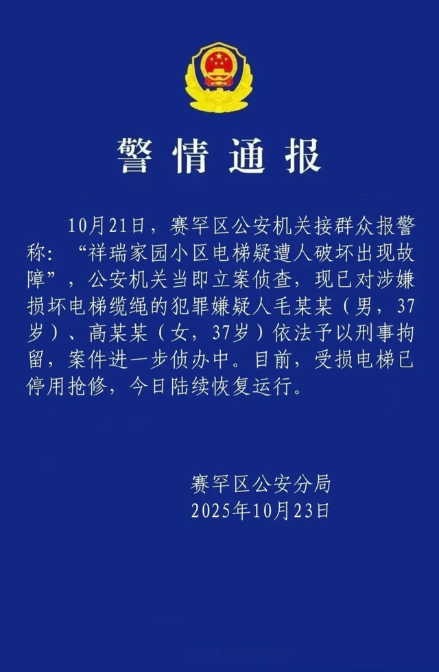 10月21日,赛罕区公安机关接群众报警称:“祥瑞家园小区电梯疑遭人破坏出现故障”,公安机关当即立案侦查,现已对涉嫌损坏电梯缆绳的犯罪嫌疑人毛某某(男,37岁)、高某某(女,37岁)依法予以刑事拘留,案件进一步侦办中。目前,受损电梯已停用抢修,今日陆续恢复运行。