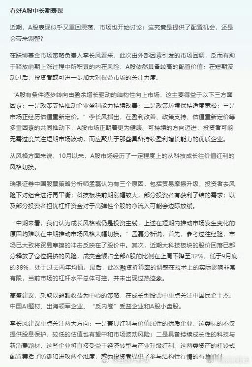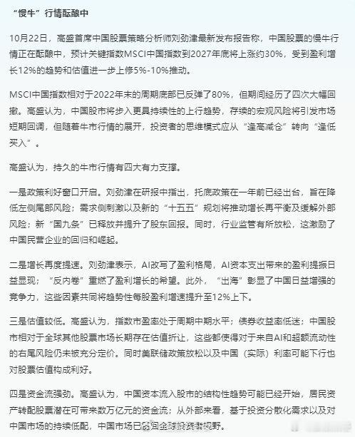 高盛、摩根大通、瑞银等多家外资机构相继发声,在中期维度上继续看好后市。高盛认为,中国股市正步入慢牛行情,随着行情的展开,投资者的思维模式应从“逢高减仓”转向“逢低买入”[思考] A股
