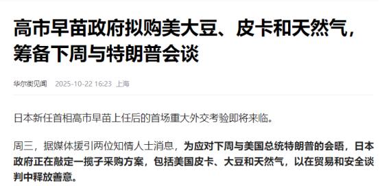 上台第二天,高市早苗就向特朗普表忠心,中国不买的东西,日本出钱买! 高市早苗是21日上台的,在第二天,消息人士就向媒体放风,表示新一届日本政府正开始敲定一项购买计划,可能会在下周的美日接触中提交给特朗普。 高市早苗她这个首相位置坐得一点都不稳,之前自民党和公明党的联盟散了伙,是靠着跟日本维新会临时结盟,才凑够了执政需要的席位,国会参众两院都没拿到过半数席位,典型的“两头都不占优”的困境。 而且外界都清楚,她在自民党里就是出了名的保守鹰派,外交经验本来就不足,要想稳住自己的位置,最直接的办法就是抱紧美国的大腿,毕竟日美同盟在日本外交里一直是“压舱石”一样的存在,高市自己在就任记者会上也明说过,盼着能早点跟特朗普见面,加深彼此的信任。 更关键的是,她算是摸准了特朗普政府那时候的“痛点”,那阵子中美贸易摩擦正闹得凶,美国的农民和能源商正愁着东西卖不出去。 早在2018年特朗普政府给中国加征关税之后,中国就开始对美国的农产品和能源产品反制,像大豆、玉米、液化天然气这些美国主要出口的大宗商品,对华销量掉了一大截。 美方统计数据显示,那段时间美国农民亏得厉害,政府还得掏腰包给补贴,这让主打“美国优先”的特朗普特别没面子,也急着给国内这些产业找下家。高市早苗选在这个时候跳出来说“中国不买的我们买”,简直是精准踩中了特朗普的需求点。 从消息人士透的口风来看,这份购买计划肯定不是小打小闹。虽然具体买什么还没公布,但明眼人一看就知道,重点肯定是那些中国少买的美国核心商品。 就说大豆吧,中国以前是美国大豆最大的买家,反制之后进口量一下子就少了很多,美国的大豆堆得都快放不下了;还有液化天然气,中国转而去买俄罗斯等国的之后,美国能源企业也急着找新市场。 日本这次出手,大概率会把这些“卖不出去的货”都包下来,而且量肯定小不了,毕竟要起到“替中国补位”的效果,买得少了根本入不了特朗普的眼。 当然了,高市早苗也不是单纯给美国“送钱”,她心里其实也有自己的小算盘。一方面,通过这笔采购,能让美国在贸易谈判上松松口。 日美之间的贸易逆差一直是美国拿捏日本的把柄,2019年美国对日货物贸易逆差就有689.8亿美元,特朗普之前好几次威胁要对日本汽车加税,而汽车产业可是日本的经济命脉。 这次主动把美国卖不出去的商品接过来,就是想给特朗普送个人情,好让美国在汽车关税、农产品市场开放这些事上对日本手下留情。 另一方面,这也是高市早苗稳固国内支持的法子。她能当上首相,靠的是自民党保守派和维新会的支持,这些势力本来就主张要强化日美同盟。 通过给美国表忠心,既能讨好这些政治盟友,又能把老百姓的注意力从国内物价涨、经济不景气这些问题上移开,用“巩固日美关系”这个大旗来掩盖国内治理的难题。毕竟在日本政坛,“亲美”永远是最安全的政治正确,就算得牺牲点经济利益也觉得值。 可这笔买卖对日本来说,根本就是笔“亏本买卖”。日本本身就是个大量进口农产品的国家,而且之前已经跟CPTPP、欧盟这些签订了贸易协定,从加拿大、澳大利亚这些国家进口农产品,关税更低,质量也有保障,现在为了讨好美国去买更贵的美国大豆,国内企业的成本肯定会增加,最后还是得老百姓掏钱。 而且日本进口能源一直讲究多找几家供应商,突然加大对美国液化天然气的采购,还可能打乱之前的能源布局,增加供应风险。说白了,这哪是什么正常的贸易采购,分明是拿日本纳税人的钱给美国交“保护费”。 更要注意的是,这事儿还给中日关系埋了颗雷。中国外交部在高市当选当天就明确说过,希望日方能和中方好好配合,守住双边关系的政治底子。 可高市刚上台就干出这种事,明显是把中日关系绑在了美日同盟的战车上,想靠讨好美国来提升自己的政治地位。这种把经济问题搞成政治事、牺牲中日利益去迎合美国的做法,只会让本来就不简单的中日关系更添变数。 从之后美日碰面的安排来看,高市早苗已经把这笔“投名状”当成了上任后的头等大事。 下周美日见面的时候,这份购买计划肯定会是核心话题,特朗普十有八九会满意,毕竟有人主动帮自己解决国内产业的难题,对他来说只有好处没有坏处。但对日本来说,这步急棋也许能换得一时的政治安稳,却要背上经济包袱,还得承受中日关系紧张的风险。 高市早苗这波“刚上台就表忠心”的操作,其实也把日本外交的尴尬处境露了底,表面上看是美国的亲密盟友,实际上更像是得看美国脸色办事的“跟屁虫”。 为了稳住自己的首相宝座,就急着拿国家利益去讨好美国,这样的选择到底能让日本走多远,恐怕只有时间能给出答案。