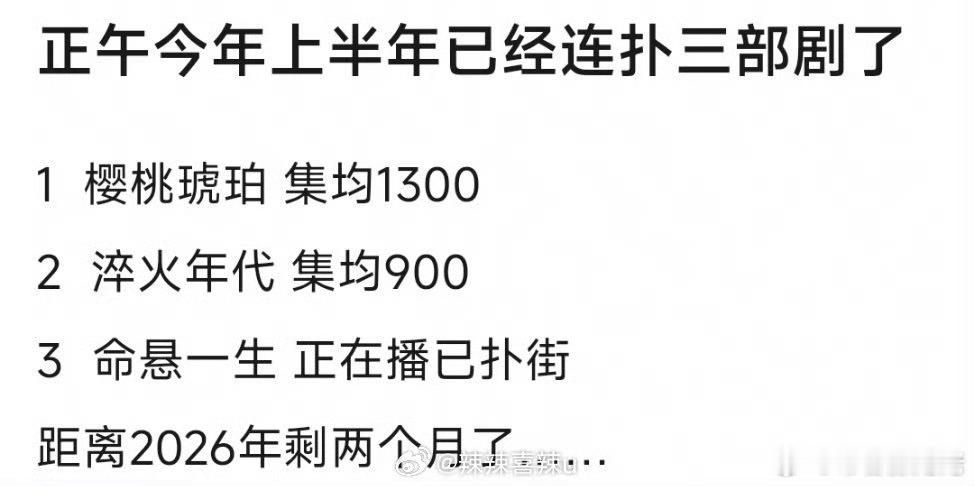 2025年的正午阳光,播了两部95生花的剧,艰难的制造又名淬火年代,主演张新成和宋祖儿,集均900万*樱桃琥珀,主演赵今麦和张凌赫,暑假档集均1300万,命悬一生,黄轩+天龙人李庚希和白宇帆,集均1000万保卫战,正午实现一年三扑,正午作为大厂,在选角和后期制作上,能不能跟上观众的需要,什么是观众想在剧里看到的,值得侯鸿亮深思了[不愧是你]