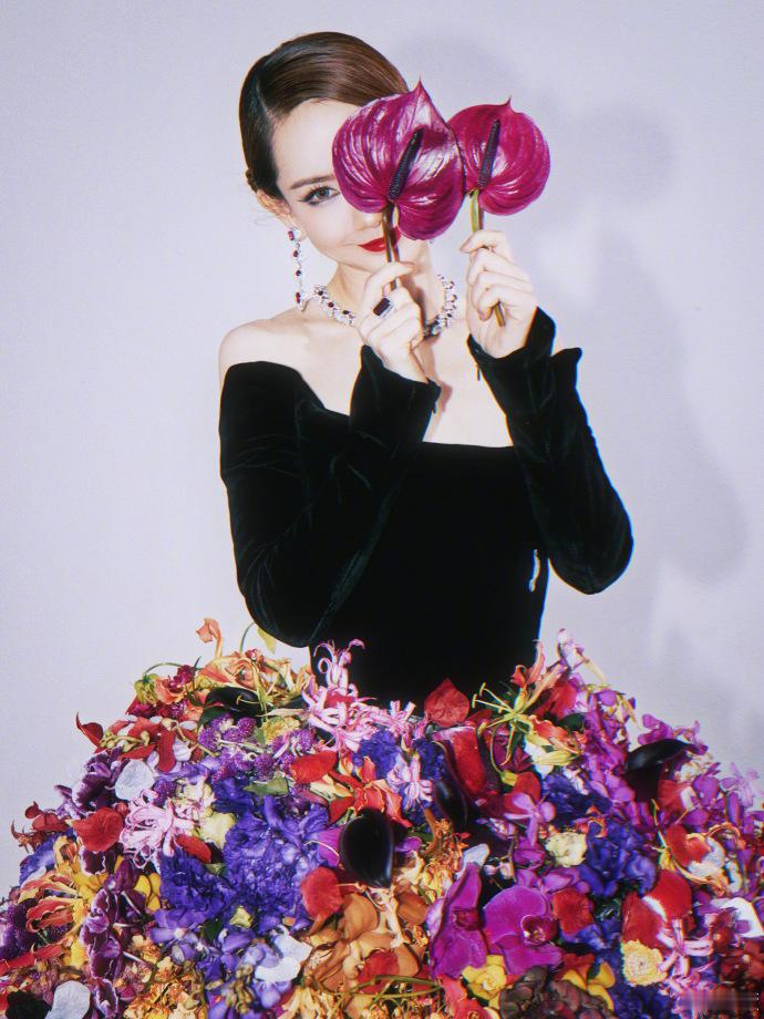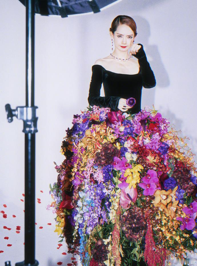 戚薇穿了一件花裙子戚薇vogue盛典出发造型,被花花点缀满的裙子!色彩饱和度很高