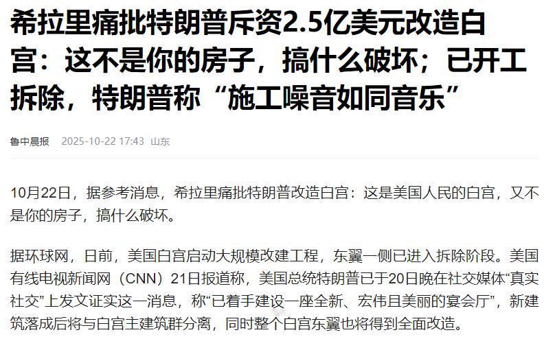 希拉里痛批特朗普,那不是你的房子,你正在摧毁白宫! 当地时间10月20日,特朗普计划的白宫大型宴会厅新建项目正式开工,紧接着白宫东翼就开始了拆除工作。 由于之前没有消息,再加上这次动工实在是太快了,包括希拉里在内的民主党人立马站出来反对,直接喊话特朗普“那不是你的房子,你这是在摧毁白宫”。 事实上,白宫不只是总统上班和住的地方,它的建筑布局藏着美国几十年的历史,东翼里还有不少有纪念意义的区域。以前不管谁想改建白宫,都得经过专门的历史保护评估,还得国会点头才行。 希拉里在公开场合就说,总统对这种国家象征得有敬畏心,不能凭着自己的想法随便改。在她看来,这种不把历史当回事的态度,不符合总统的身份。 不少民主党议员也跟着附和,认为这是特朗普在越权,没把行政权力的边界当回事。 更让争议闹得更大的是,这个项目开工的时间点太敏感了。现在美国联邦政府正处于停摆状态,很多公共服务因为没钱都停了,几十万联邦雇员拿不到工资,生活都受影响。政府这边都乱成一锅粥了,特朗普却想着先搞白宫改建。 民主党方面直接指出,这时候把资源用在这种不是非干不可的建设上,就是不把老百姓的需求放在眼里,也伤了纳税人的心。 更加雪上加霜的是,最近美国各地都在搞“不要国王”的抗议活动,这让白宫改建的事儿更有政治象征意味了。 本来这些抗议就是反对特朗普政府的权力太集中,民主党正好能把改建白宫和这个抗议联系起来,说特朗普想按照自己的意思改白宫,其实就是想强化自己的权威,和大家反对“君主式集权”的诉求正好对上了。 虽然特朗普团队一再强调,这个项目的钱都是私人捐的,没花纳税人一分钱,但民主党显然是不买账的,反倒觉得在政府停摆、抗议不断的时候搞这个,分明是在挑衅大家的情绪。 面对这些质疑,特朗普政府也有自己的说法,他们说改建是为了让白宫的接待能力更强、功能更完善,这样以后办外交活动、公共活动都更方便,而且所有流程都符合规定。但这种解释根本没让争议停下来,反而让民主党和共和党在这件事上的矛盾更突出了。 这么一看,这场白宫改建的争论已经成了美国政坛新的吵架焦点,接下来事情会怎么发展,对美国的政治局势肯定还会有更多影响。