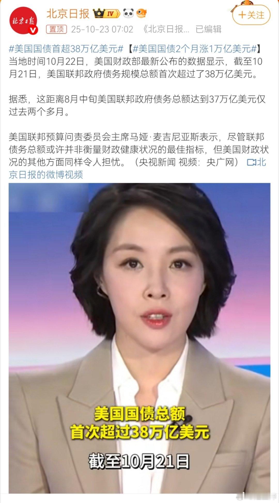 美国国债首超38万亿美元,现在美国总共有3.4亿人口,这相当于每个美国人都欠世界380000÷3.4=111765美元,按照今天的汇率,约合79.66万元人民币。美国人均存款也还不到这个数字的一半,人均存款是动态的,包含老人孩子等等,所以这样来看,美国人的负债规模,非常可以,就算给全世界当牛做马,就算天天扛沙袋修金字塔、修长城,也得好几辈子才能还清啊…[哈欠] 美国国债首超38万亿美元