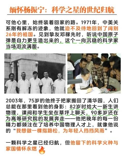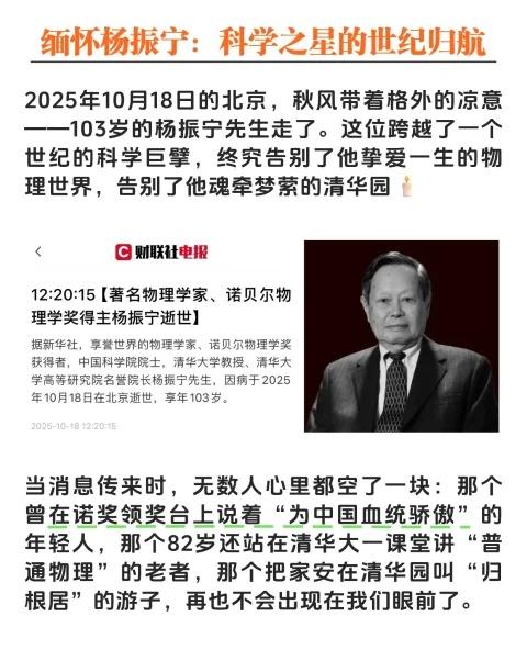 缅怀杨振宁????️103岁诺奖得主的长寿智慧 2025年10月18日,103岁的物理学泰斗杨振宁先生离世????️ 从西南联大铁皮教室的求学少年,到诺奖台上“为中国血统骄傲”的获奖者,再到晚年扎根清华的“指路松”,杨振宁的故事里不仅有科学的璀璨,还有家国的深情。 这位跨越世纪的科学传奇,不仅以“弱相互作用下宇称不守恒”“杨 - 米尔斯规范场论”改写物理史,也诠释了长寿智者的人生密码 他的长寿,源于规律饮食(荤素搭配、结合粗粮、放慢进食和避免饮酒),更离不开妻子翁帆的悉心陪伴,美满的婚姻带给了他最安稳的幸福和最强大的支持。 此外,其他“活到老,学到老,工作到老”的诺奖得主的长寿秘籍也有共同之处。例如莫言写到的“保持饥饿感”有利于激发他的写作灵感并保持健康活力;诺贝尔物理学奖获得者丁肇中也严格控制饮食,滴酒不沾;与杨振宁一同获得诺奖的李政道也在幸福的婚姻中获得了温暖的支持与慰藉。 诺奖成就难以复制,但这份养心、养身的智慧,人人可学~ 先生虽逝,星光永存✨ 杨振宁 杨振宁爷爷一路走好 长寿 长寿秘籍 饮食健康 婚姻幸福