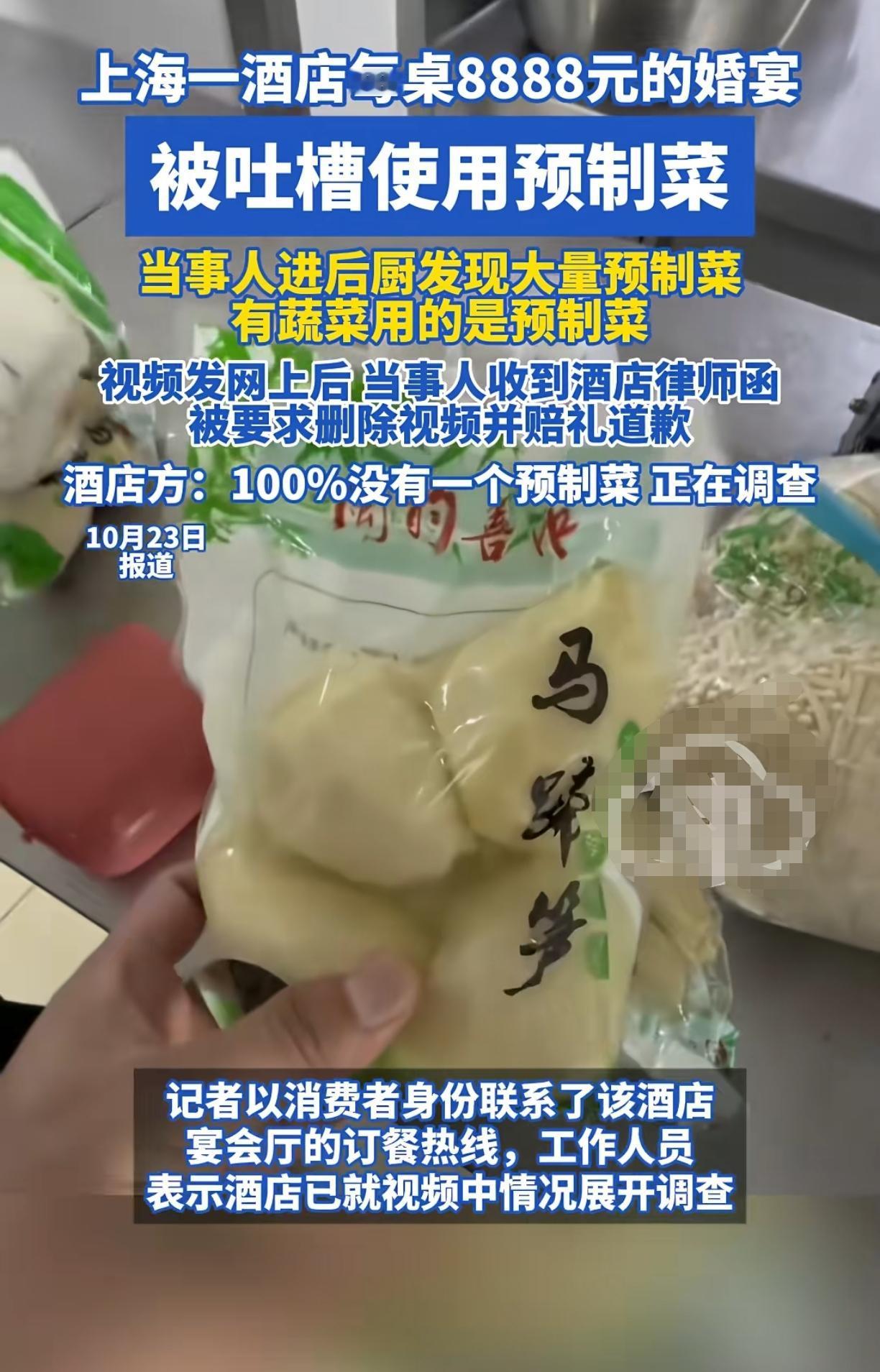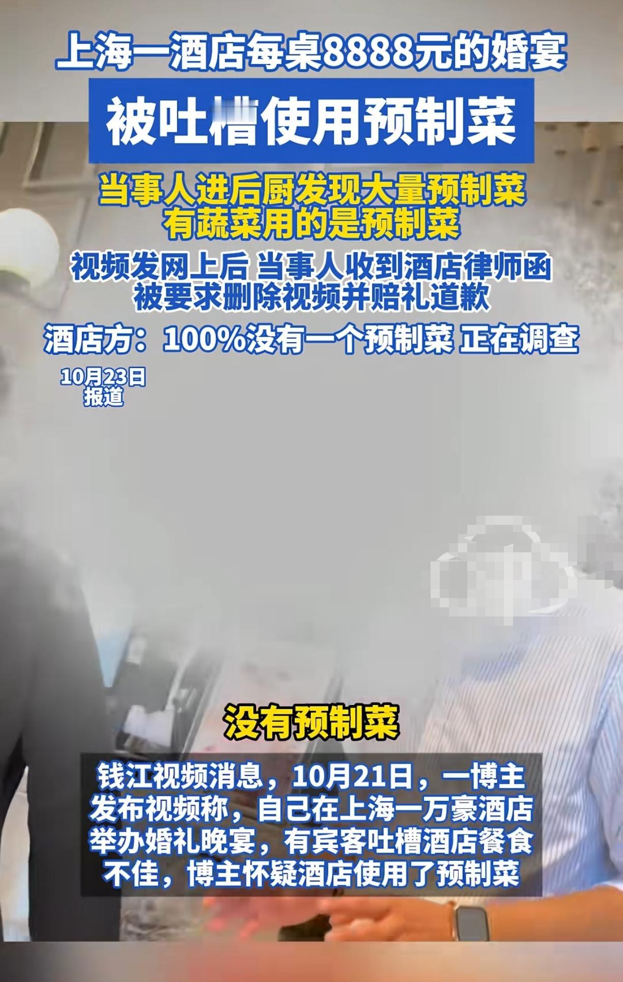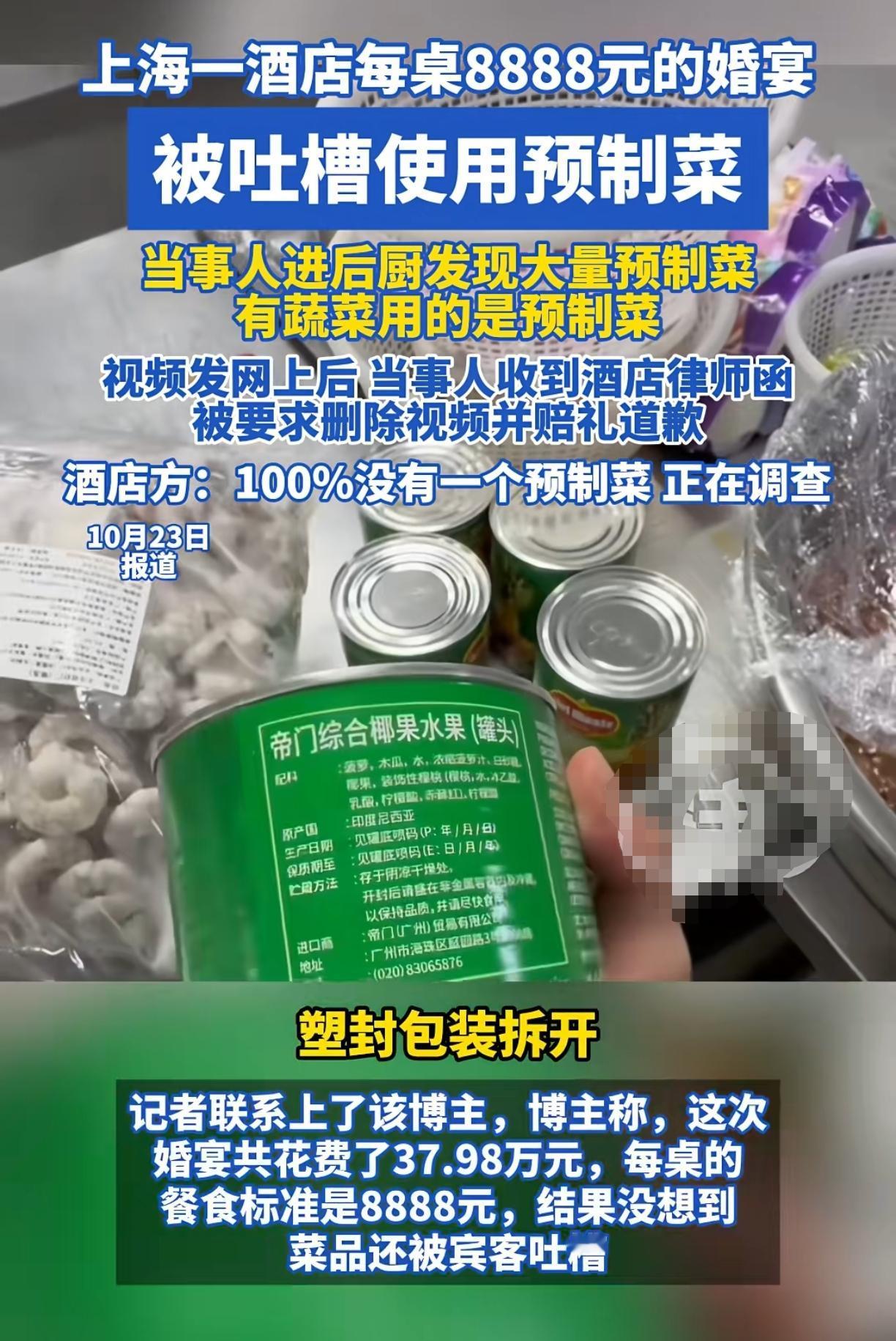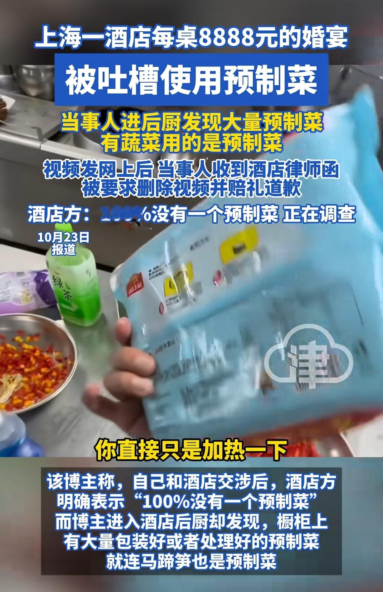 上海某豪酒店真硬核啊,8888一桌的餐标的婚宴酒席全是预制菜,被客人在后厨发现大量预制菜包装,马蹄笋,水果罐头等 后厨不开火炒菜,直接烧水将菜热好即可上桌,对于女子的说法酒店方还不认账,我们100%没有预制菜,这都被抓包了,还能抵赖,工作人员信念感是真强! 现在酒店方表示“事件正在调查,并要求该博主删除视频评论并向酒店方道歉”! 这事搁谁身上能受得了 按酒店这波操作一桌8888,酒店一桌最少挣8000,赚飞了都 网友评论“只有顾客是新鲜宰的”,农村酒席888都能做一桌很好的了,这8888得上龙虾鲍鱼燕窝了吧。 88就能吃到的东西结果花了8888,这个冤大头谁都不会愿意当的,支持该女士维权到底,彻底将预制菜曝光在阳光下! 按罗永浩的说法,其实大家并不是不能接受预制菜,只是预制菜要有预制菜的价格 某豪啊某豪,这么大个企业,咱知错就改 不要去步某贝的后尘!