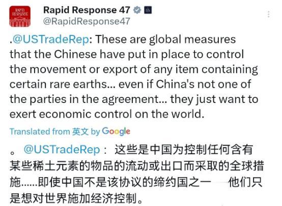 美国贸易代表对我们的行为感到非常的不舒服!10月22日,美国贸易代表格里尔表示,中国为控制任何含有特定稀土元素的物品的流动或出口而采取的全球措施,这说明中国也只是想对世界施加经济控制。虽然中国正在测试不同的说法,以证明其控制稀土流动的升级行动是合理的,但现实情况是,中国希望对世界施加经济控制。 美国历届政府都允许中国利用美国在稀土开采领域首屈一指的技术——而现在,中国正在“胁迫”我们和世界其他国家。我们不会退缩。 很显然,对于我们的稀土管制措施,美国方面对我们是非常的不满。不过,美国方面的抱怨,这也恰恰说明,我们的稀土管制政策确实打疼了美国。 从资源储量来看,美国其实并不缺稀土。美国地质调查局2024年报告显示,美国稀土储量约1300万吨,占全球9%,排名世界第三。 但美国的稀土产业链存在致命短板。加州的芒廷帕斯矿山在2025年重启后,年产量约3.2万吨,能满足美国国内70%的轻稀土需求。 然而矿山产出的轻稀土碳酸盐,后端的萃取分离环节仍需将原料运往中国四川完成。这意味着美国本土的高纯稀土氧化物产能几乎为零。 为了摆脱对中国稀土的依赖,美国开始寻求盟友合作。10月20日,特朗普与澳大利亚总理阿尔巴尼斯签署了一项价值85亿美元的关键矿产协议。协议内容包括美澳两国在未来6个月内分别向稀土项目投资10亿美元、在西澳大利亚建设一座年产100吨的先进镓精炼厂等。 但澳大利亚虽然是全球第四大稀土储量国,其生产基础设施仍不发达,加工相对昂贵。澳大利亚悉尼科技大学关键矿产研究员玛丽娜·张表示,即使美国及其所有盟友将稀土加工作为国家项目,至少需要五年才能赶上中国。 而中国的稀土管制措施并非针对特定国家,中国商务部多次强调,此次出台的稀土出口管制措施是依法依规完善自身出口管制体系的正常行为,只要是用于民用用途的、合规的出口申请,都可以获得批准。 事实上,宝马、大众等德国车企在今年4、5月份就陆续获得了中方的稀土供应通行证;在中美元首通话后,中国政府也向通用、福特、斯特兰蒂斯三家美国车企的稀土供应商发放了临时出口许可。 美国也在尝试技术突破,美国太平洋西北国家实验室发现,特定种类的海藻具备惊人的稀土富集能力,可将周围环境中的稀土离子浓缩百万倍以上。但这项技术目前还处于实验阶段,近海养殖的生态影响评估、重金属污染迁移风险、规模化生产下的成本控制等问题都有待解决。专家分析,美国若想将这项技术转化为工业应用,至少需要10年时间。 欧盟曾宣布2025年禁用中国稀土,但现实情况是,欧盟的替代链建设困难重重。查塔姆研究所指出,自工业时代以来从未有过如此局面,中国掌控着99%的重稀土供应链,还独家掌握着提取、精炼或磁铁回收技术。欧盟的替代链建成之日,怕是F-47都该退役了。 很明显美国现在面临的困境,其实是自己长期不重视稀土产业的结果。上世纪80年代,美国曾控制着全球90%的稀土供应,但后来因为环保问题和产业空心化,逐渐放弃了稀土加工产业。如今,美国想重建稀土产业链,不仅要面对技术瓶颈,还要承受高昂的成本。特朗普签署的85亿协议,短期内很难看到成效。 要知道中国的稀土管制政策,是维护国家安全和利益的必要举措。中国拥有全球最完整的稀土产业链,这是数十年技术积累和市场选择的必然结果。我们不会用稀土作为武器,但也不会允许别人利用我们的技术来威胁我们的安全。美国若想摆脱对中国稀土的依赖,就应该尊重市场规律,通过平等合作来解决问题,而不是一味地指责和施压。 在这场稀土博弈中,美国的抱怨恰恰证明了中国政策的有效性。我们有理由相信,随着中国稀土产业的不断升级和技术创新,我们在全球稀土市场的话语权将会越来越大。而美国若不能正视现实,继续采取对抗性的政策,最终受损的只会是自己的利益。