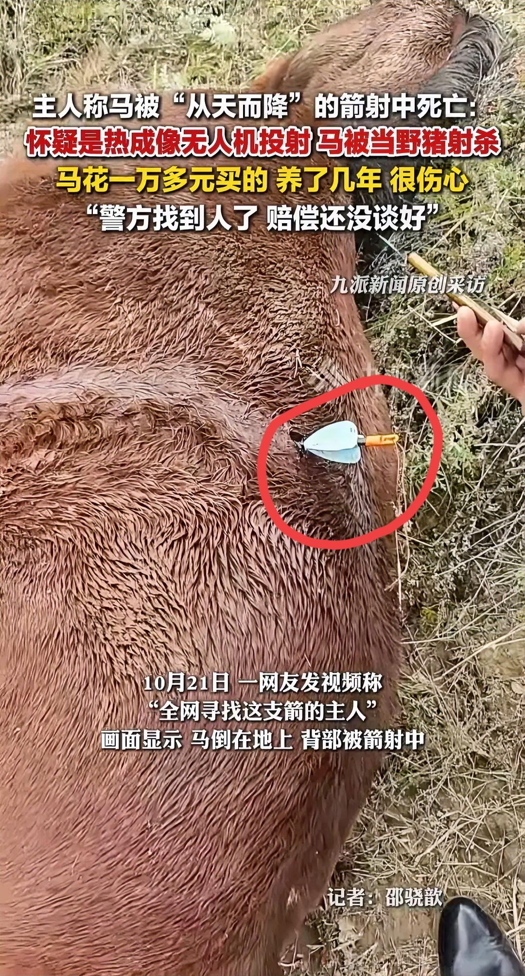马被“从天而降”的箭射杀,全网寻找这支箭的主人! 养了好几年的心头好 平白无故丢了性命 任谁都得心疼到掉眼泪 更气人的是 这箭大概率是有人瞎折腾弄出来的 怀疑是热成像无人机搞的鬼 把温顺的马当成野猪误伤 先不说赔偿谈不拢的事 单说这种操作就离谱到极点 不管是射箭还是玩无人机 都有明确的安全规矩 室外射箭得留够安全距离 无人机狩猎更是乱弹琴 连目标都分不清 就敢随便发射 这哪里是休闲娱乐 分明是拿别人的财产和安全当儿戏 警方已经找到人 可赔偿的事还没着落 别以为一句误伤就能了事 自己犯的错 就得承担起该负的责任 无规矩不成方圆 不管玩什么都得有底线 这次伤的是马 下次要是伤到了人 那可就不是赔钱能解决的了 你觉得该怎么严惩这种粗心又不负责任的人