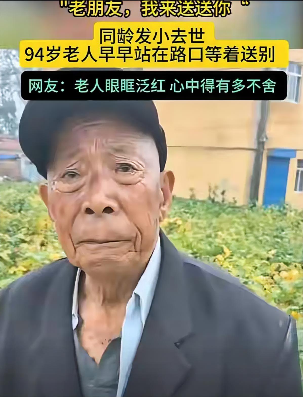看到94岁的爷爷穿西装等候着,我没哭, 看到他一手拄着拐杖一手扶着石块,我也没哭, 但当他说出这句话时,我最终还是忍不住哭了! “老朋友,我来送送你”,这句话,耗尽了这位老人的全部气力,他明白,这是他们最后一次见面了,以后要见,就是一起在下面相见了。 将近百年的发小,搁谁谁都会伤心,他们共同熬过了战争的年代,又共同经历了国家的腾飞,友谊终究熬不过岁月。 看到他那湿润的眼眶,难过沧桑的脸庞,我就有点受不了了,想象不到,以后我该如何面对这种生死离别。 我们也只能在剩余的时光中,珍惜眼前人了。