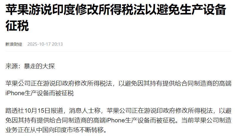 印度又要割韭菜了:苹果8条产线从中国搬到印度后,印度拿出1961年法律,说苹果不能只交印度的税,而且全球营业额的总税收… 近几年为了避开中美贸易摩擦的关税,苹果咬牙把8条iPhone产线从中国迁到印度,还拍着胸脯说今年要把印度产能翻一倍。 当时印度政府表现得特别热情,又是给“生产挂钩补贴”,又是降零部件进口税,把苹果哄得开开心心在印度建厂。可谁能想到,这看似诚意满满的合作背后,藏着个等着收网的“大坑”。 最近,印度直接搬出1961年的《所得税法》,里面有条规定:只要公司在印度有“商业联系”,不管总部在哪,全球营业额都得在印度缴税。 苹果在印度既有子公司又有代工厂,印度税务部门直接拍板——这就是“商业联系”,全球营收都得算税基。简单说就是,苹果在中国卖一部iPhone,印度要抽税;在美国卖一部,印度照样要分一杯羹,那苹果当然急眼了。 要知道印度工厂现在70%的零件还得从中国运过去,高端的Pro机型良品率比中国低10%,本来成本就比中国高5%-10%。现在再来这么一笔“全球税”,这生意简直没法做了。 更让人揪心的是,印度税务部门还有“追溯征税”的先例,当年对沃达丰就是直接改法律,让企业补交十年前的税,苹果哪敢冒这个险? 印度这招其实是“一石二鸟”。一方面,印度制造业占GDP的比例不升反降,从2020年的15.4%跌到2024年的14.3%,财政口袋紧,急需找新财源。另一方面,想用税收逼着苹果加速本土化——印度早就要求2025年苹果零部件本地采购率提至50%,但目前才15%,征税正好能当“催命符”。 苹果也不是坐以待毙,近几个月高管天天往印度跑谈判,要求修改税法,说设备所有权在自己手里,但使用权在代工厂,不能算“商业联系”。甚至提出让代工厂拿设备所有权,就为了躲这波税。可印度这边态度强硬,毕竟到嘴的肥肉哪能轻易松口? 事实上,这也不是印度第一次“收割”外资。之前小米被指“非法转移资金”,48亿元资产直接被冻结,最后折腾了两年才解冻;vivo也被指控转移455亿元营收,银行账户被封,光调查就拖了18个月。 这些案例让外资企业对印度又爱又恨——市场大是真的,但政策风险也是真的高。 现在苹果陷入两难:留在印度,要面对巨额税务成本;搬走,又会失去美国市场的关税优惠——美国对印度产iPhone零关税,对中国产却收20%,而且印度产iPhone已经占美国进口份额的44%,供应链根本不敢断。 这场税战最后大概率是苹果“破财消灾”,要么多交税,要么加快在印度扶持本地供应商。同时苹果肯定会往越南、墨西哥等地分散产能,毕竟谁也不想把鸡蛋放一个随时可能翻的篮子里。