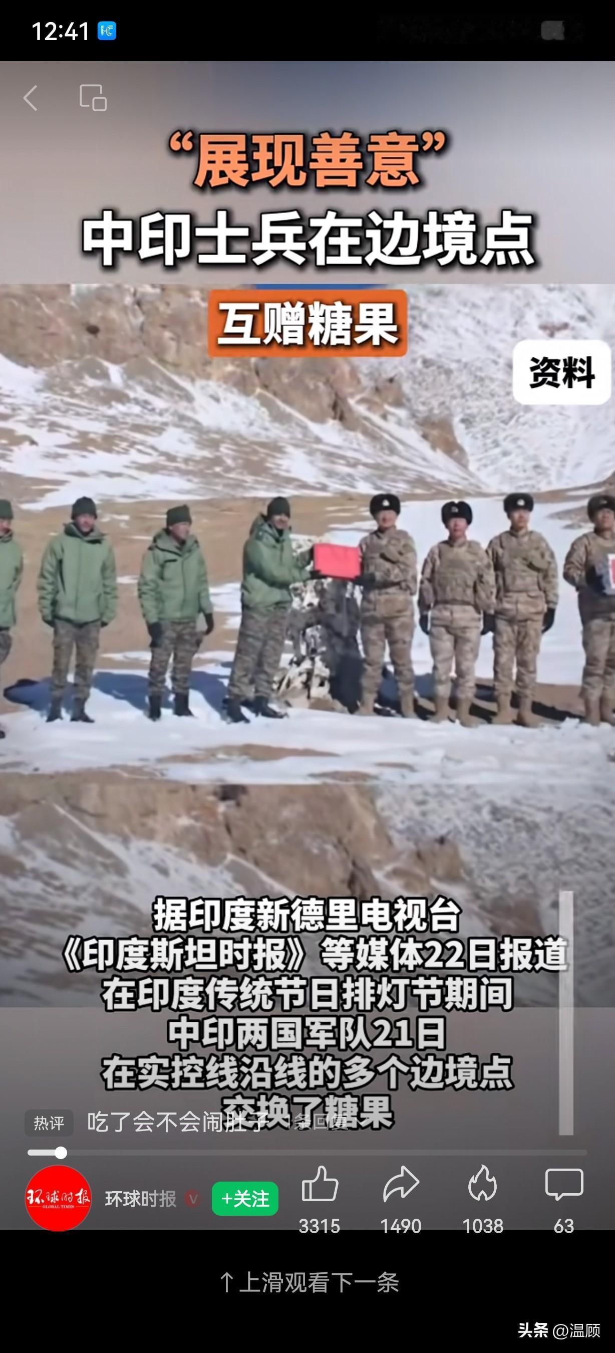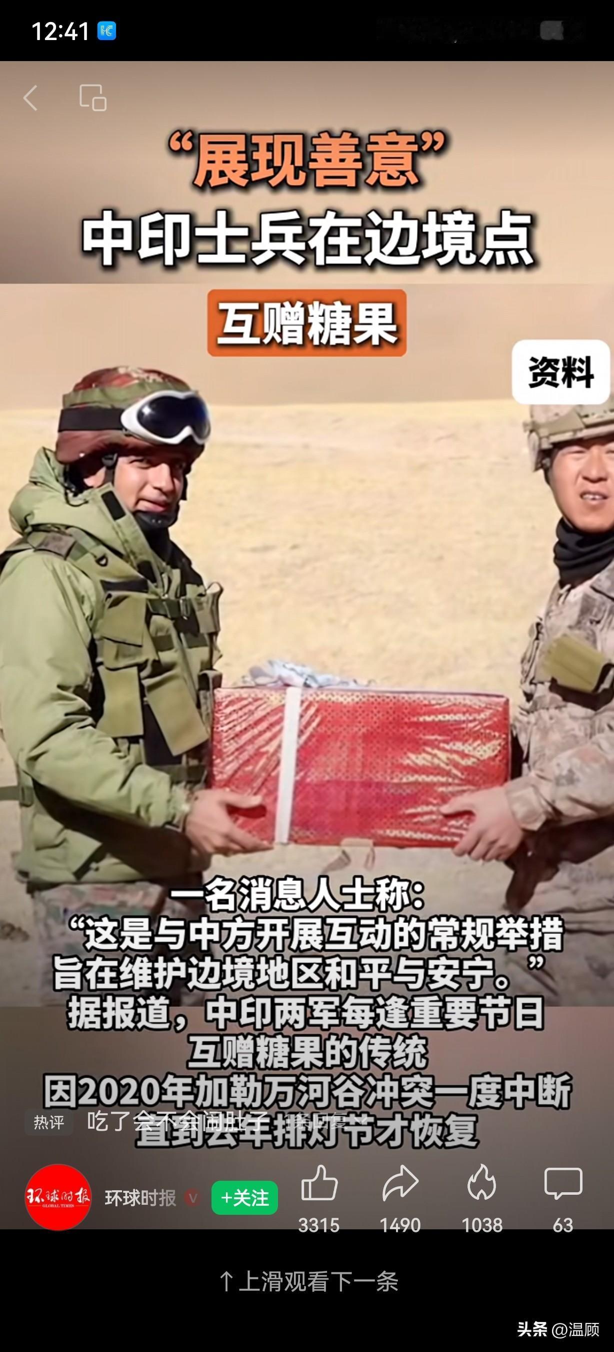 中印边境士兵交换糖果…据印度新德里电视台、《印度斯坦时报》等媒体22日报道,在印度传统节日排灯节期间,中印两国军队21日在实控线沿线的多个边境点交换了糖果。 现在咱们不但可以交换果糖,连煎饼果子都可以,海拔4300的地方,咱的后勤补给应有尽有……