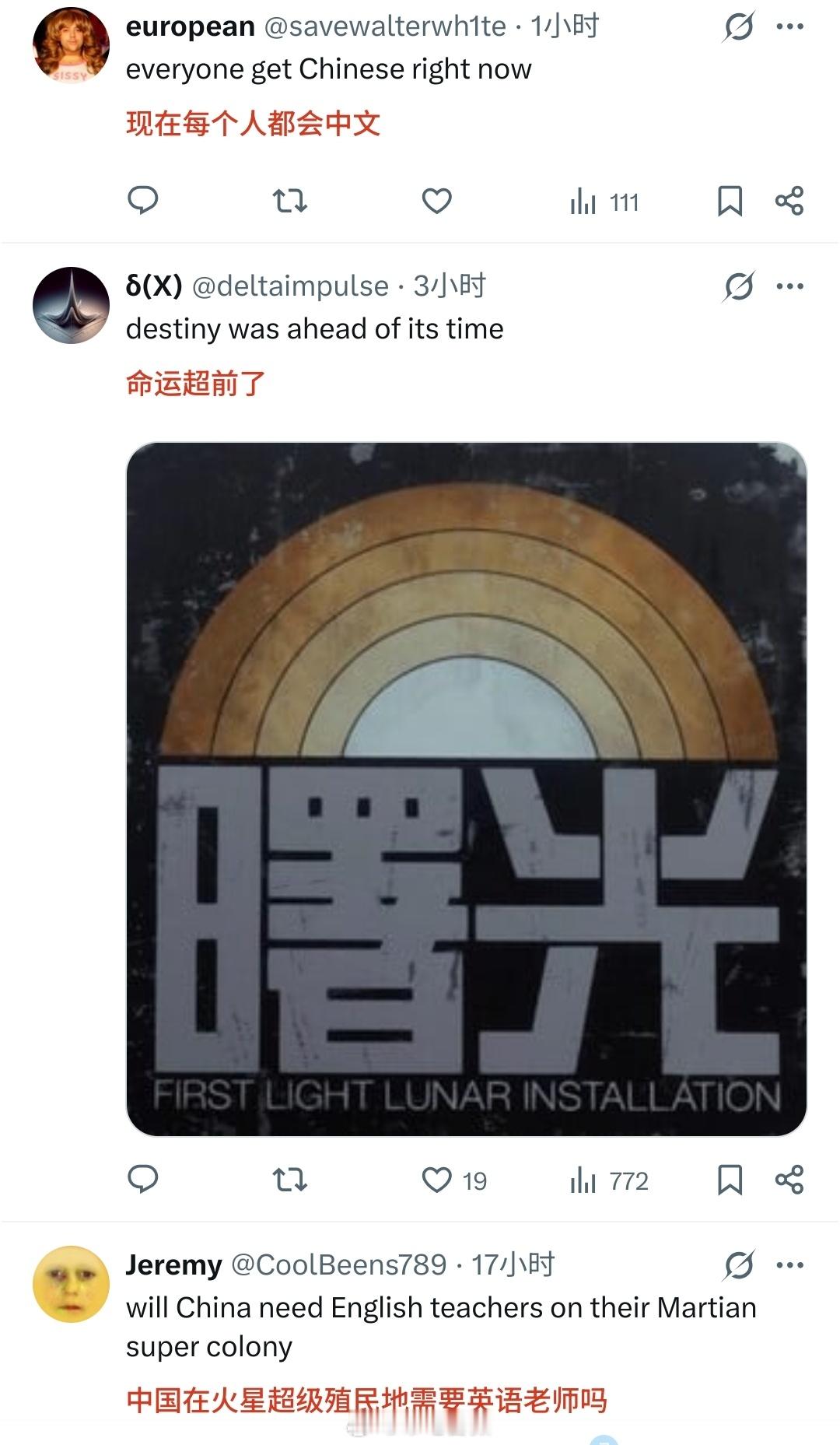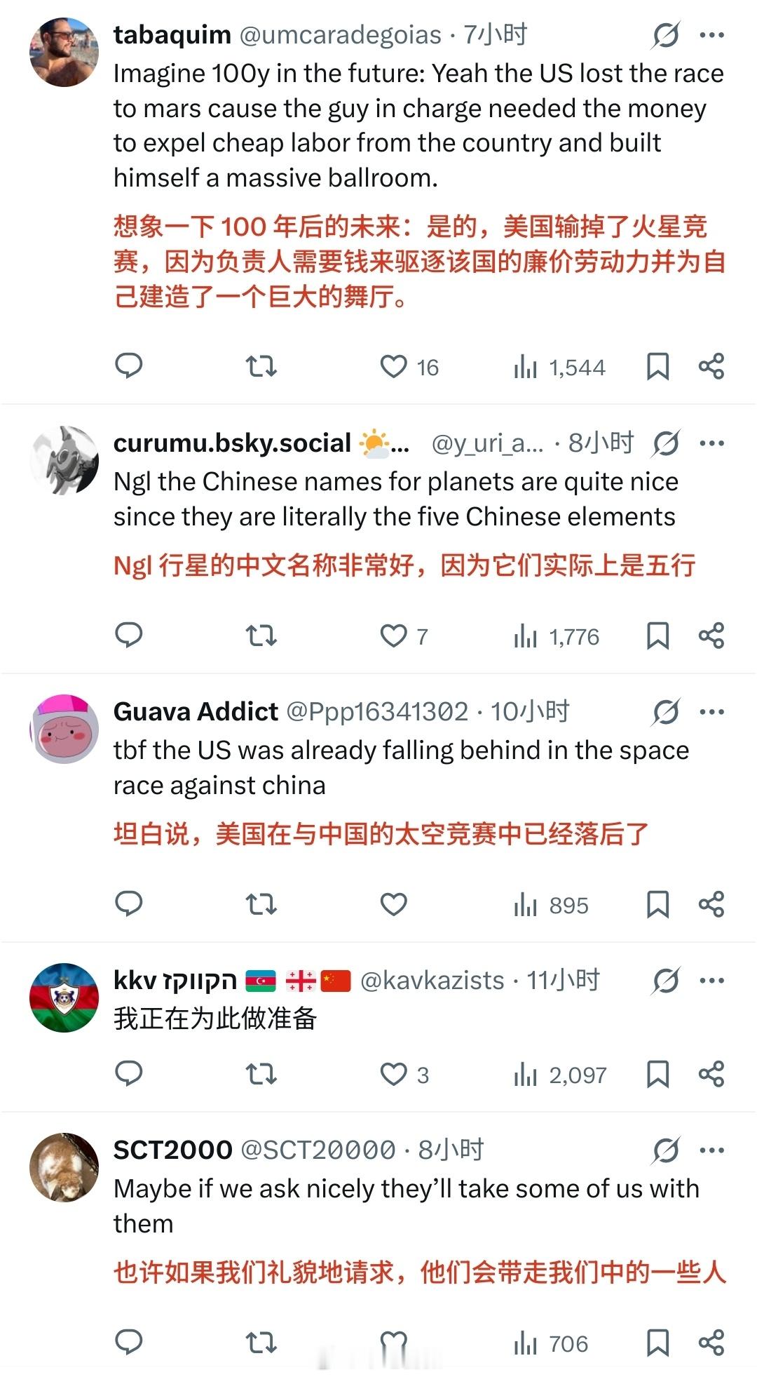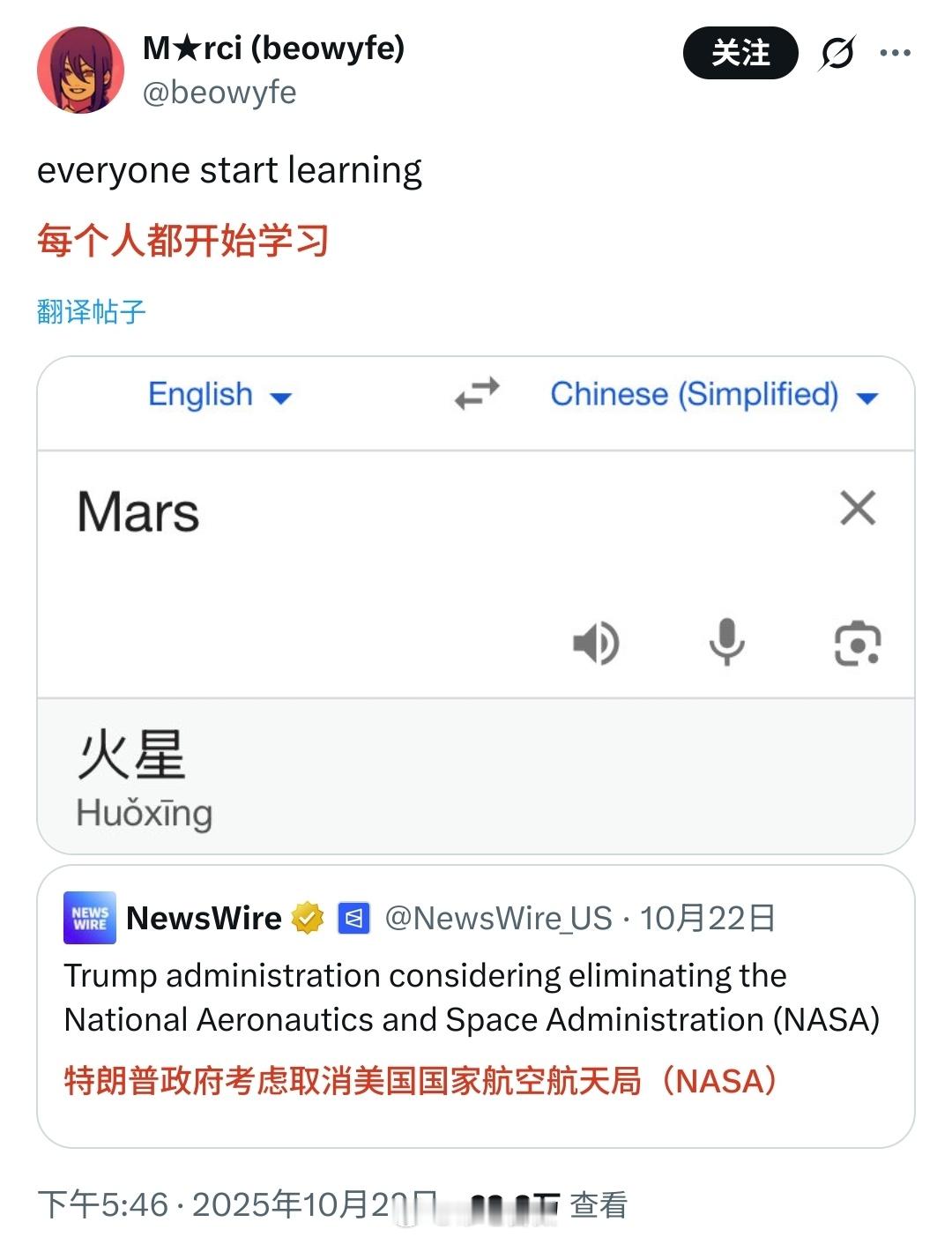 传闻美国政府考虑取消NASA,或将其并入交通部后,美国网友开始学习中文,学的第一个词是:火星。