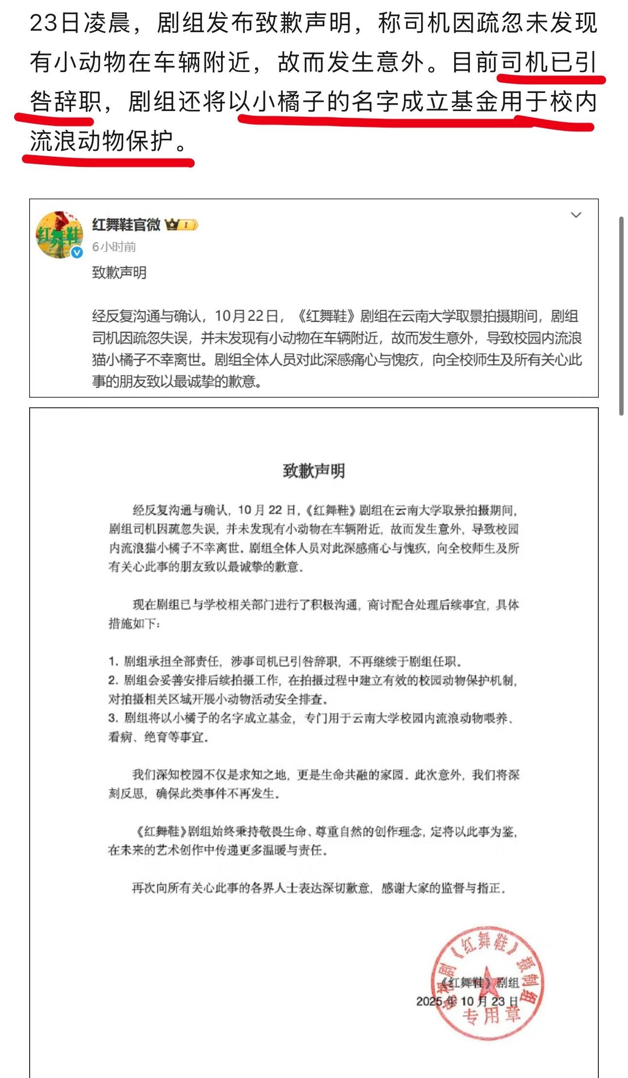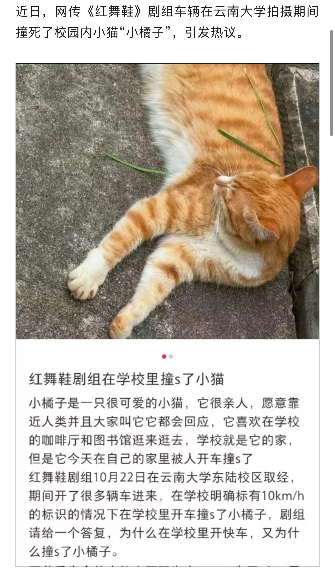 《红舞鞋》剧组车辆在云南大学拍摄期间撞死了校园内小猫“小橘子”