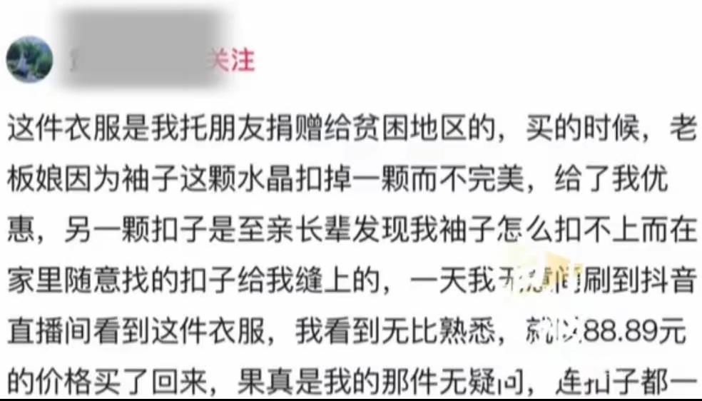 女子直播间88元买到自己捐的衣服:四川黄女士捐赠的带米白纽扣和空缺扣眼的白蕾丝上衣,被直播间以88.89元卖“孤品尾货”,她确认后买回;辽宁女士也遇类似情况,央视记者发现华南尾货市场多旧衣冒充尾货,监管已关注。